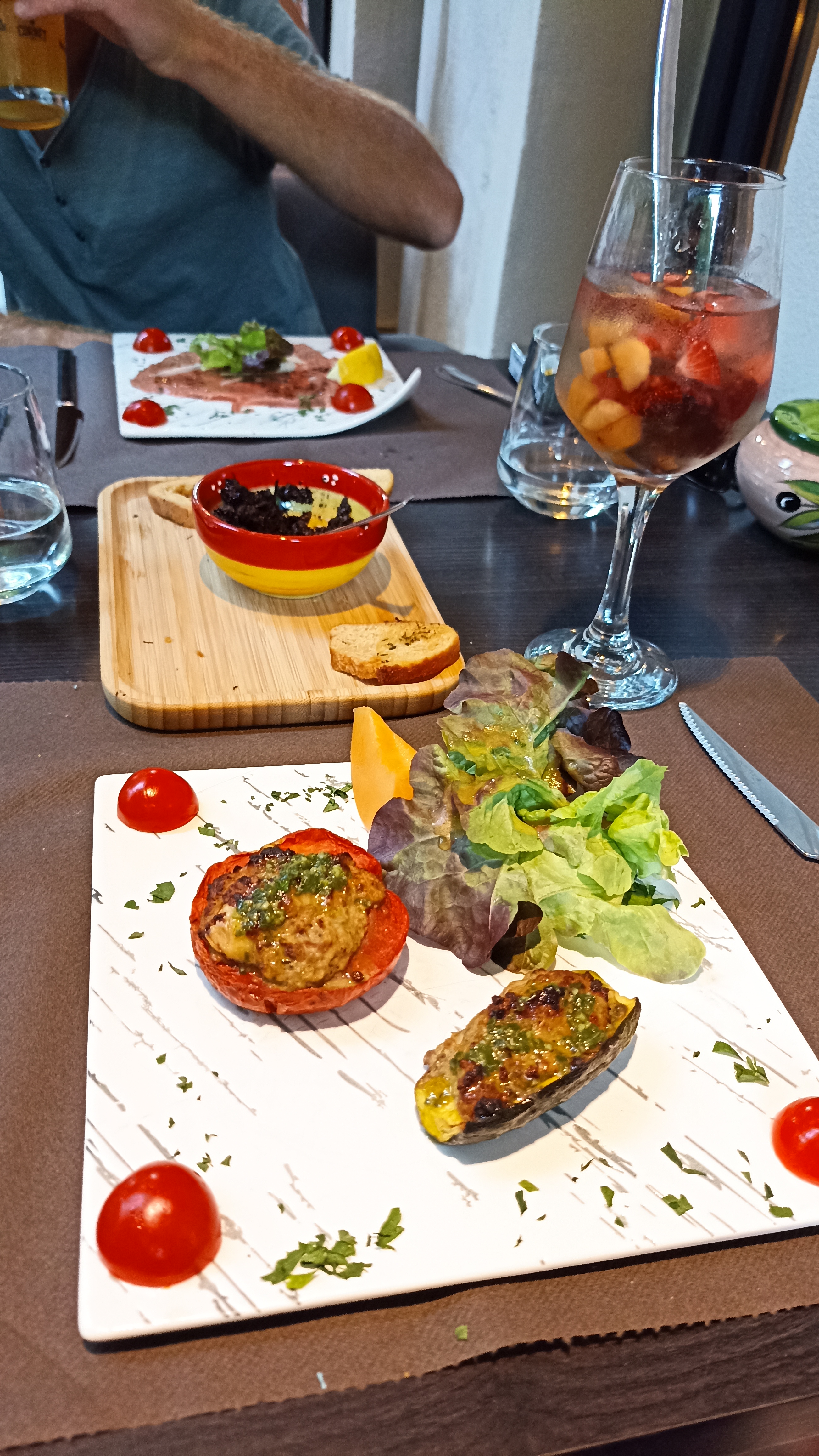 Resto sympa bien placé belle terrasse mais un dimanche midi par une grosse chaleur pas de parasol sur la terrasse (la tempête les avait tous cassés ??? quand ??) 1h30 d attente pour être servi .il a fallu réclamer les boissons commandées pour au moins se désaltérer et patienter. Service long et pagaille. Mon amie et moi même avions opté pour une entrée et un dessert. Quand l entrée (petits farcis provençaux ), est arrivée nous nous sommes regardées, nous avons cru à une mise en bouche ? Mais non!!! Petits farcis , vraiment à rire. (Quel dommage tellement surprises , je n ai pas pris de photos). 3 petits morceaux, (courgette, aubergine, et poivron) pas plus gros qu’ un pouce et encore. La farce ? Une petite boulette de viande à base de merguez ou je ne sais quoi, sèche , croutée , chauffée réchauffée, bref immangeable . Pour 16 € . Je vous rassure Nos farcis provençaux ne sont pas à cette image, Idem pour les autres plats , aucune saveur et rien dans l assiette pour le prix. C est vraiment se moquer de sa clientèle même si les 80 % ne sont que de passage, Et de l irrespect. Le nouveau patron très accueillant devrait pourtant se remettre un peu en question ??? Au lieu de se trouver toujours de fausses excuses .