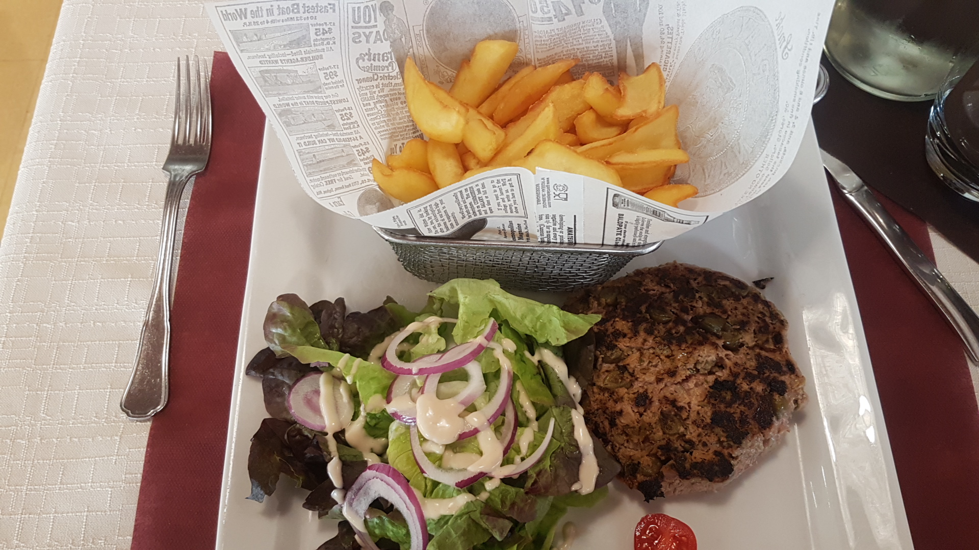 Pas mauvais ni très bon ,le service agréable sauf pour l'addition en caisse où l'on nous a demandé quel était le numéro de table et qu'il nous on fait attendre alors qu'on leurs a dit où nous étions créant une queue derrière nous . Cher pour une quantitée limitée,déçu de la salade,hamburger au niveau d'un fast food et surtout abusé pour les boissons, ex:whisky à 7 € et café à 2€ À choisir je préfère le comptoir des viandes à environ 1 à 2 kilomètres