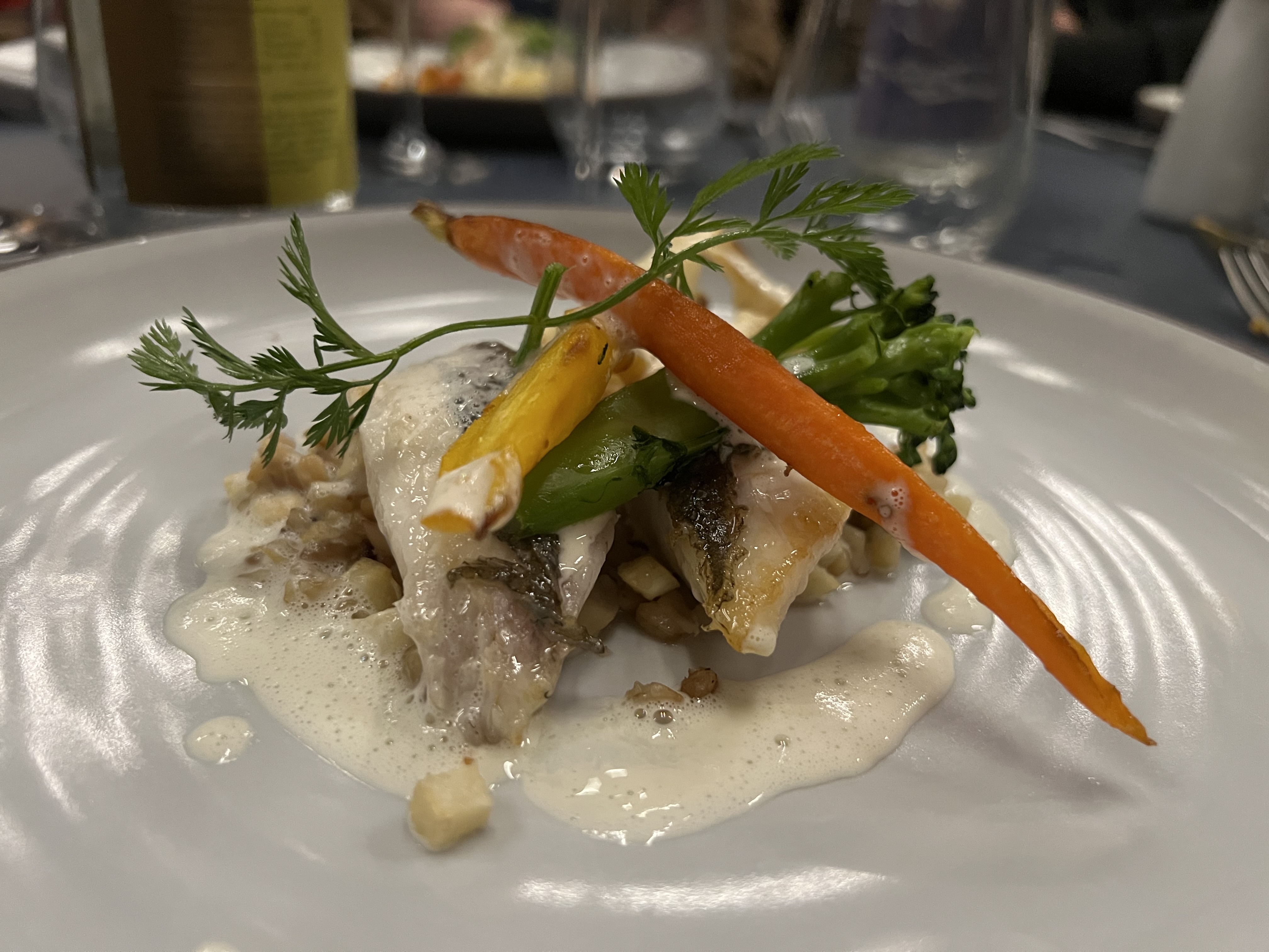 Nouveau chef, cuisine excellente, beau mariage terre/mer, cabillaud et ses petits légumes croquants, vin régional parfait avec nos plats