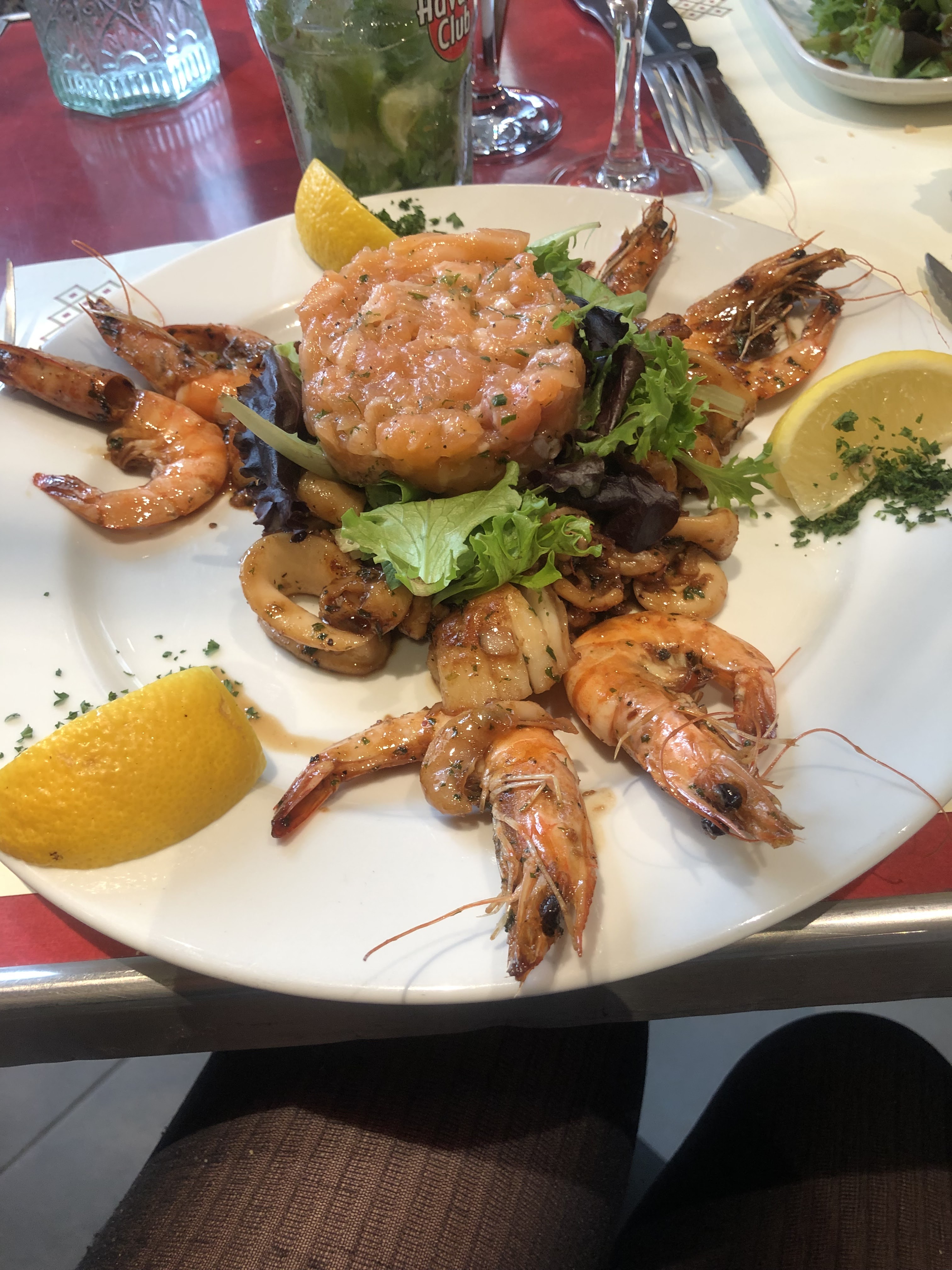 J'ai pris un repas copieux de fruits de mer, notamment une salade de fruits de mer, et je suis tombé malade peu de temps après avoir quitté les lieux. Une très mauvaise expérience je dois dire. Donner 3 étoiles uniquement aux serveurs attentifs.