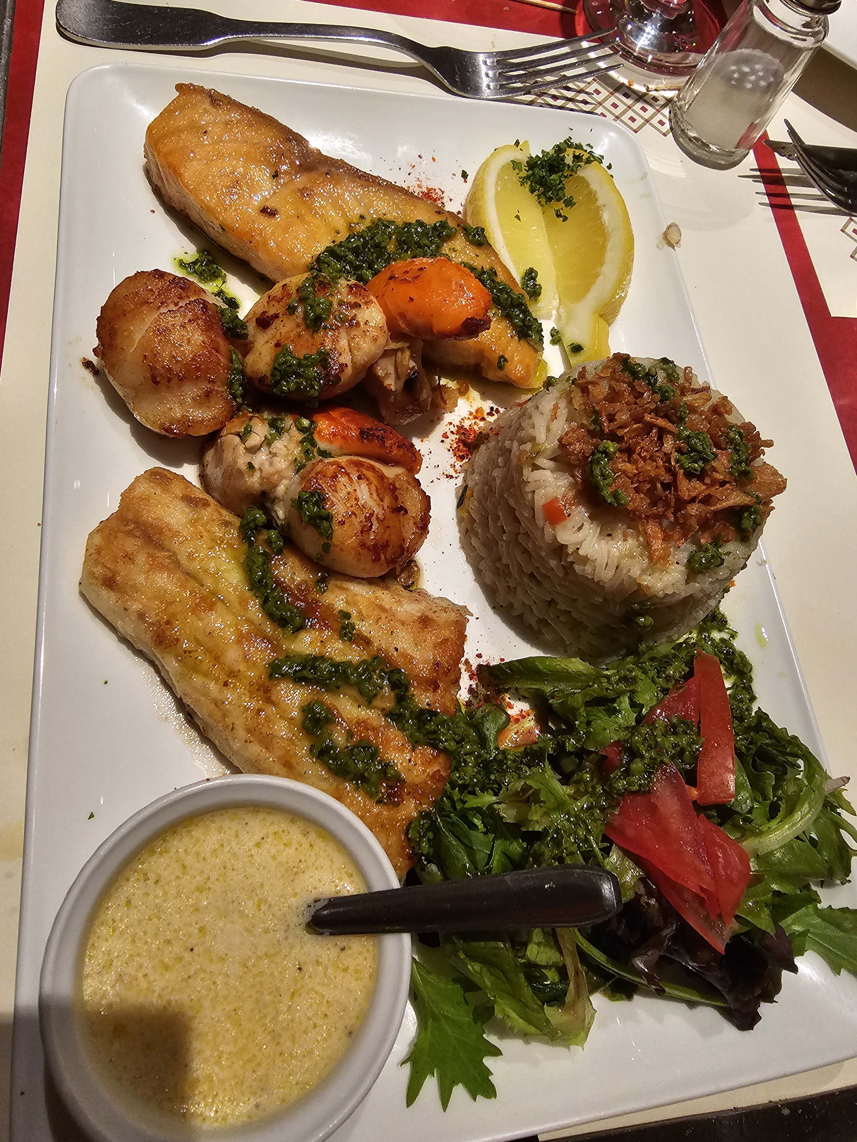 Repas le mercredi 13 mars. Pourquoi rajouter un avis positif? L’accueil souriant vers 22h00 après un spectacle? La planche de la mer aux goûts variés et subtils à qui sait prendre le temps? La suggestion brochette gambas noix St Jacques accompagnée d'une sauce basilic et ses linguines, bien servie et délicieuse ? Le filet mignon de porc sauce miel juste comme il faut, avec les frites maison auxquelles j’ai ajouté la sauce au basilic volée dans l’assiette de ma compagne?(une idée pour le service peut être) Le tout, accompagné de deux verres de vin très bon. Ambiance et déco sympa, façon bistro. Juste la distance des WC à 100m après le bar. ;) Super pour un repas après spectacle. Je crois que l’on peut arriver jusque 23h00 pour y manger. Forcément, je reviendrai.