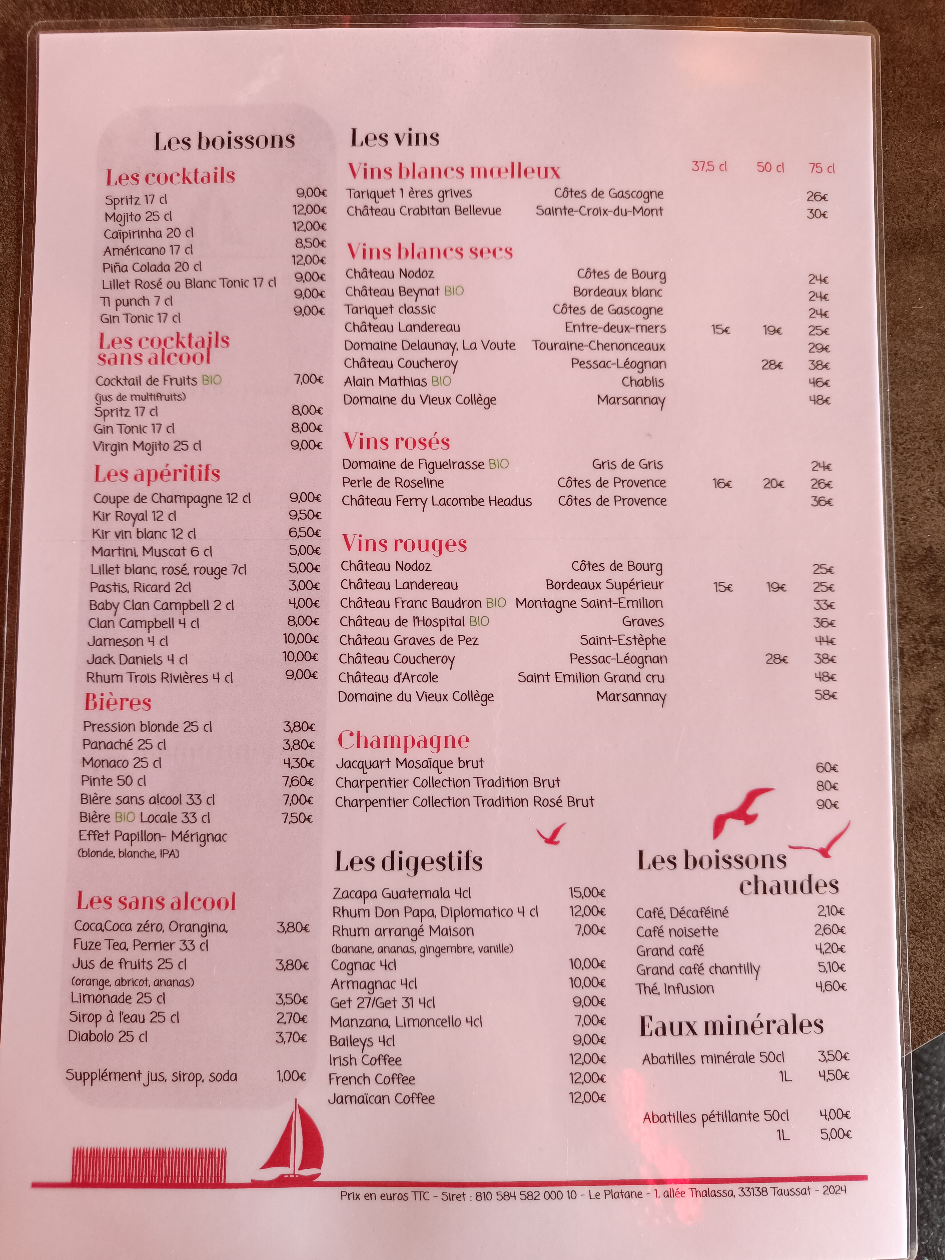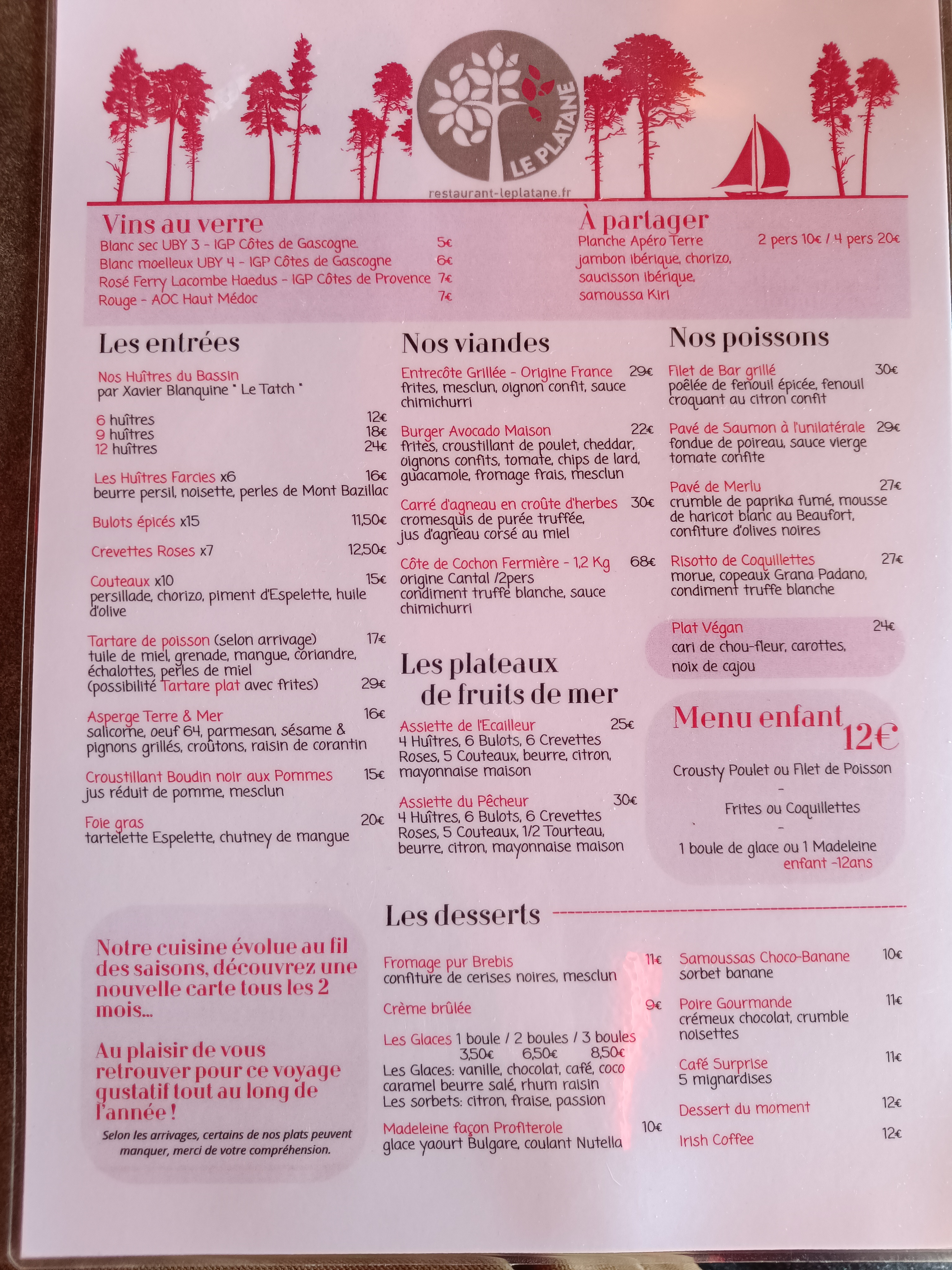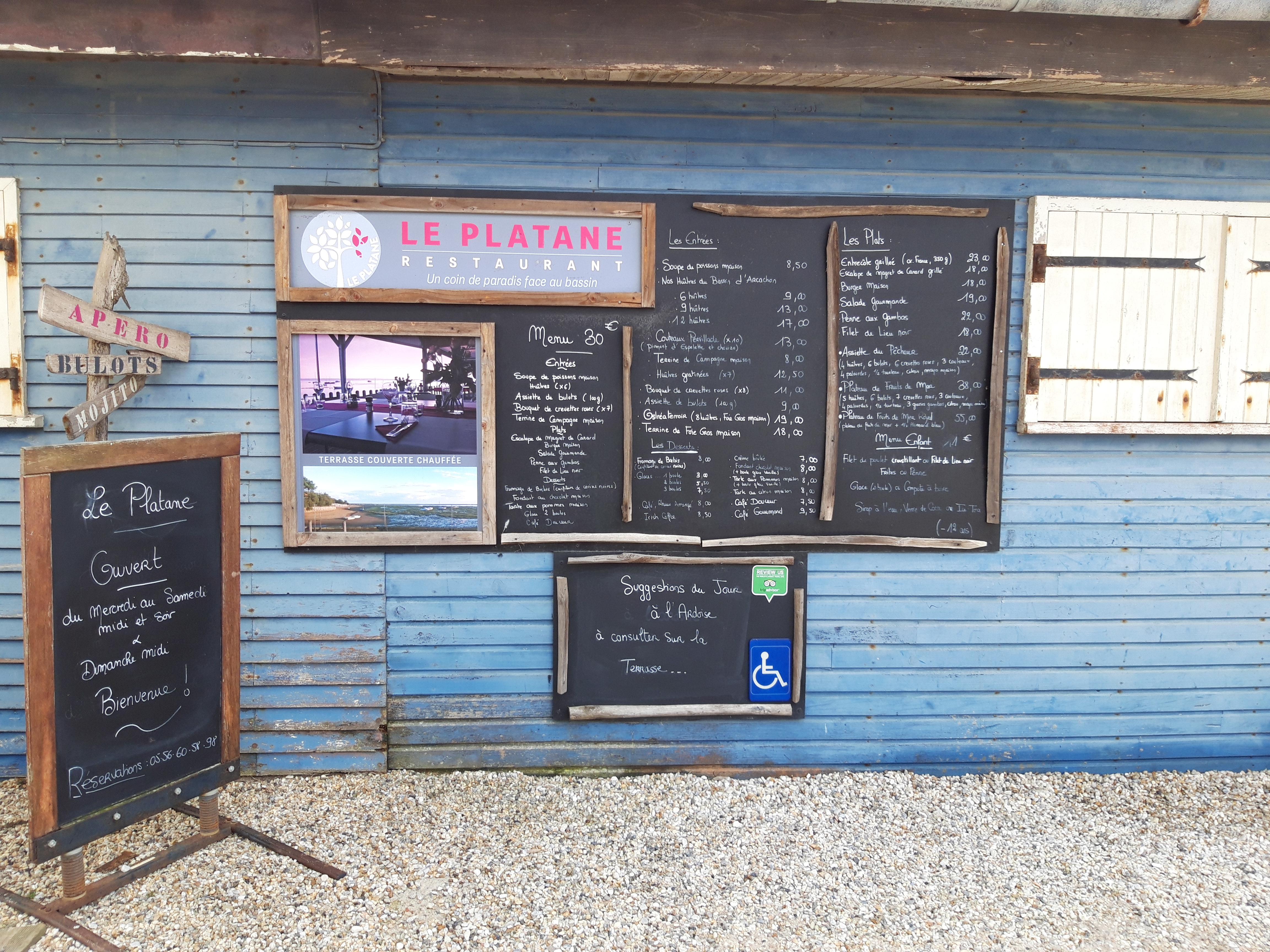 Bonjour à Tous, Dimanche dernier, nous avions réservé pour 2 personnes à 13h00. Nous avons eu un très bon accueil avec une table & une vue imprenable sur le port ostréicole du Taussat. La cuisine était parfaite en entrée des couteaux avec du chorizo, ails, persils délicieux... en plat principal Bar aux Fenouils & Pavé de merlu . Tout était parfait sauf le temps mais pour ce dimanche le plaisir était dans l'assiette. Je recommande ce restaurant & pour le coup le nom du restaurant n'est pas usurpé un vrai Platane prône à l'entrée du restaurant. Cordialement,