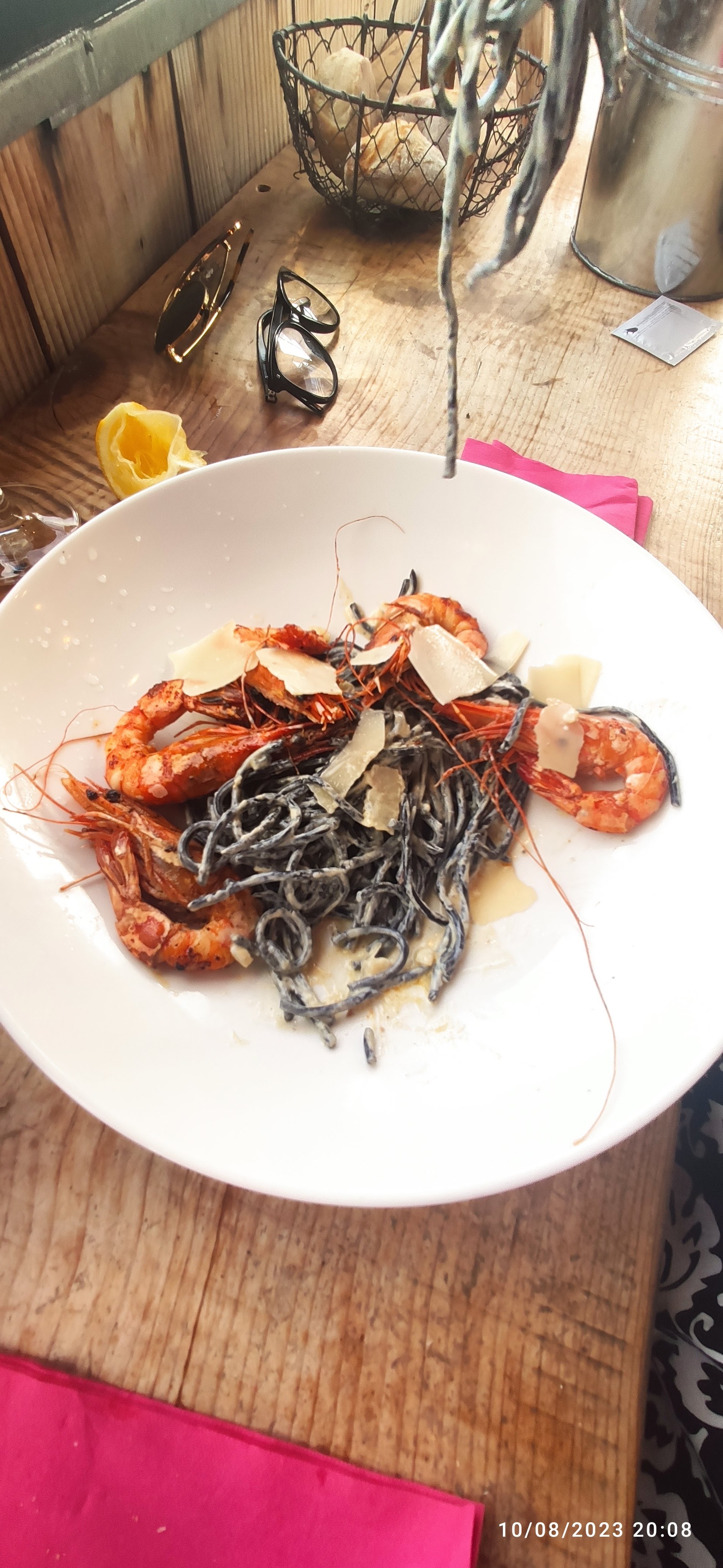 Découverte de ce ptit restau au bord de l eau. Personnel agréable et souriant Service rapide Et le tout de l entrée au dessert du moment. Très bon le tout dans un cadre agréable J y retournerai 🤩. Pâte à l'encre de seiche et gambas 😋😋😋.