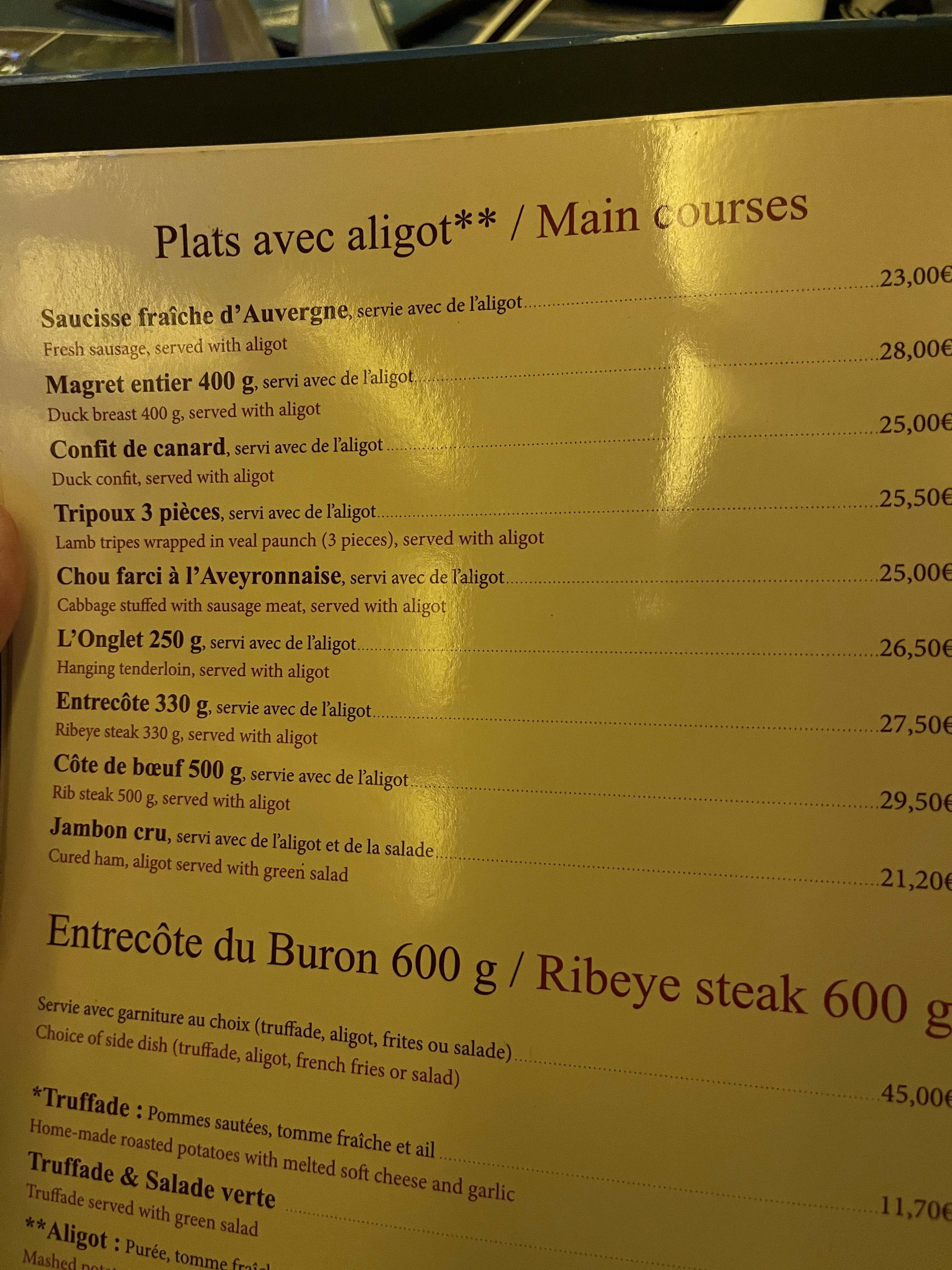 Bien évidement je vais conseiller l’aligot qui est super bon! Les portions sont très généreuses. Par contre il est compliqué d’avoir une place, attendez vous à attendre 20/30 minutes. Le prix est un peu élevé mais correspond bien à la qualité des plats qui nous sont servis. Je recommande!