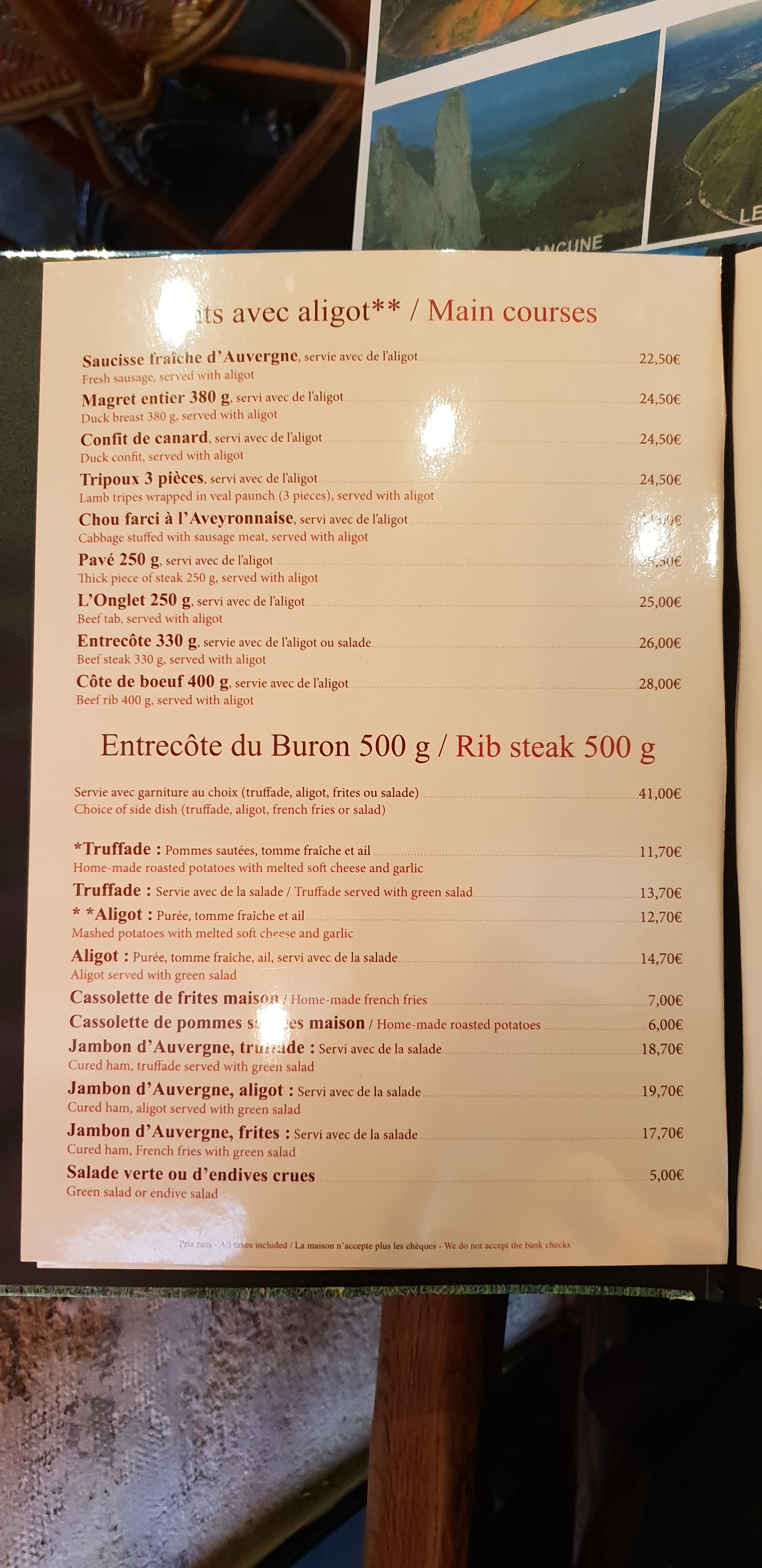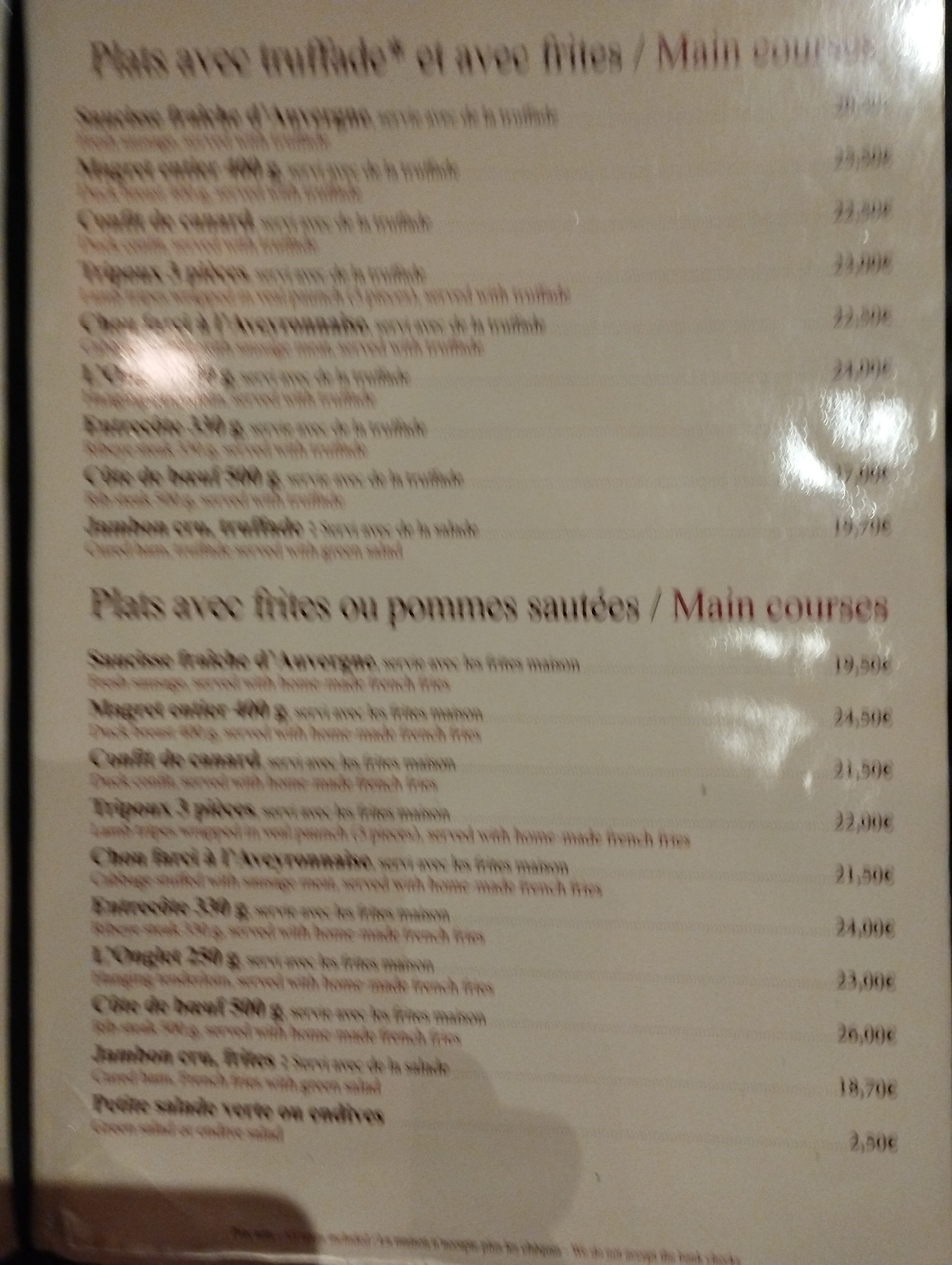On conseil si vous voulez déguster un aligot ou particulièrement une trufade ! Les prix sont plutôt dans la fourchette haute mais les quantités sont elle très généreuses et ne vous laisserons pas sur votre faim !
