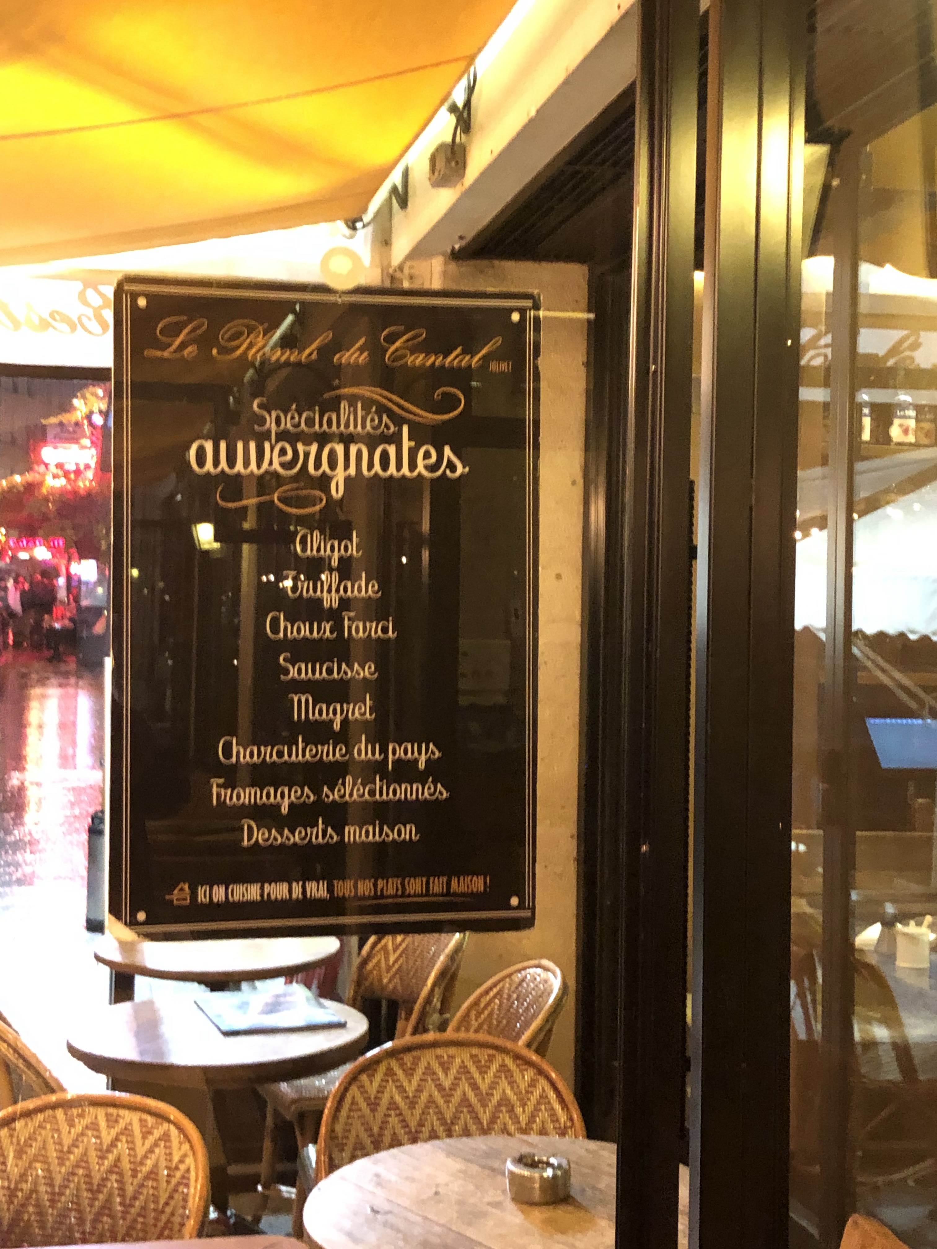 Nos amis parisiens nous ont fait découvrir ce très bon restaurant situé dans le quartier de Montparnasse proche des théâtres. La cuisine est auvergnate, j'avais pris la saucisse truffade, mon mari le magret de canard avec l'aligot. Les portions étaient correctes, les viandes cuites à point. Le serveur passe avec sa casserole d'aligot et sert les clients ! Beaucoup de monde un dimanche soir de Pentecôte ! Nous reviendrons sûrement