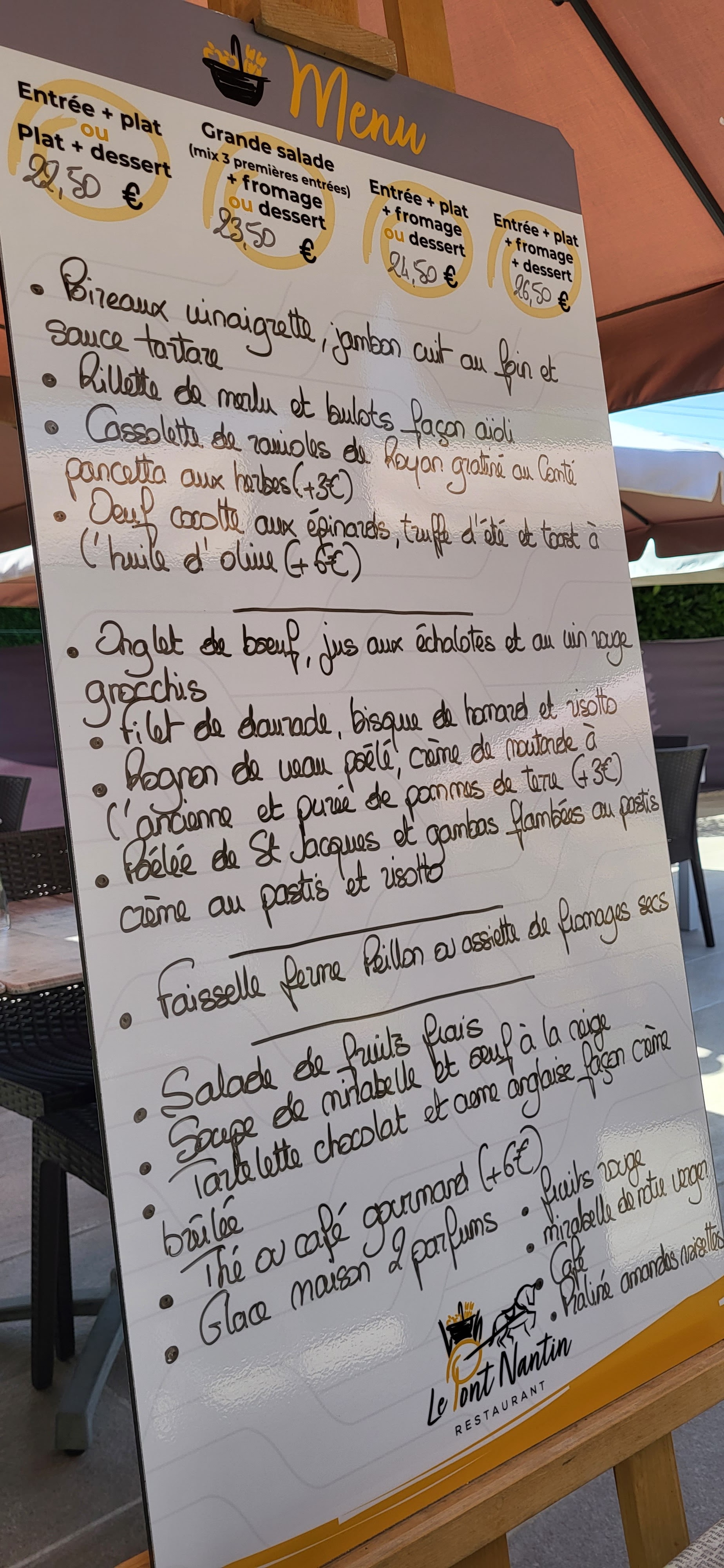 Une très belle terrasse, un cadre vraiment très beau. Menu du jour excellent avec plusieurs choix entre entrées, plats et desserts. Acceuil et service supers.