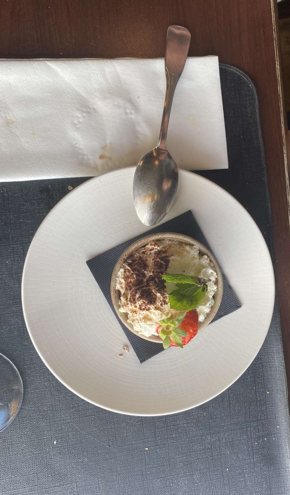 Repas le 31 octobre 2023 à 13 heures. Assis à une table près de la porte d'entrée souvent ouverte, notamment pour servir les clients en terrasse : courants d'air froid désagréable. Plats copieux. Soupe de poisson à peine tiède. Plat principal correct. Riz au lait pas assez cuit à mon goût. Vin local correct. Service excellent.
