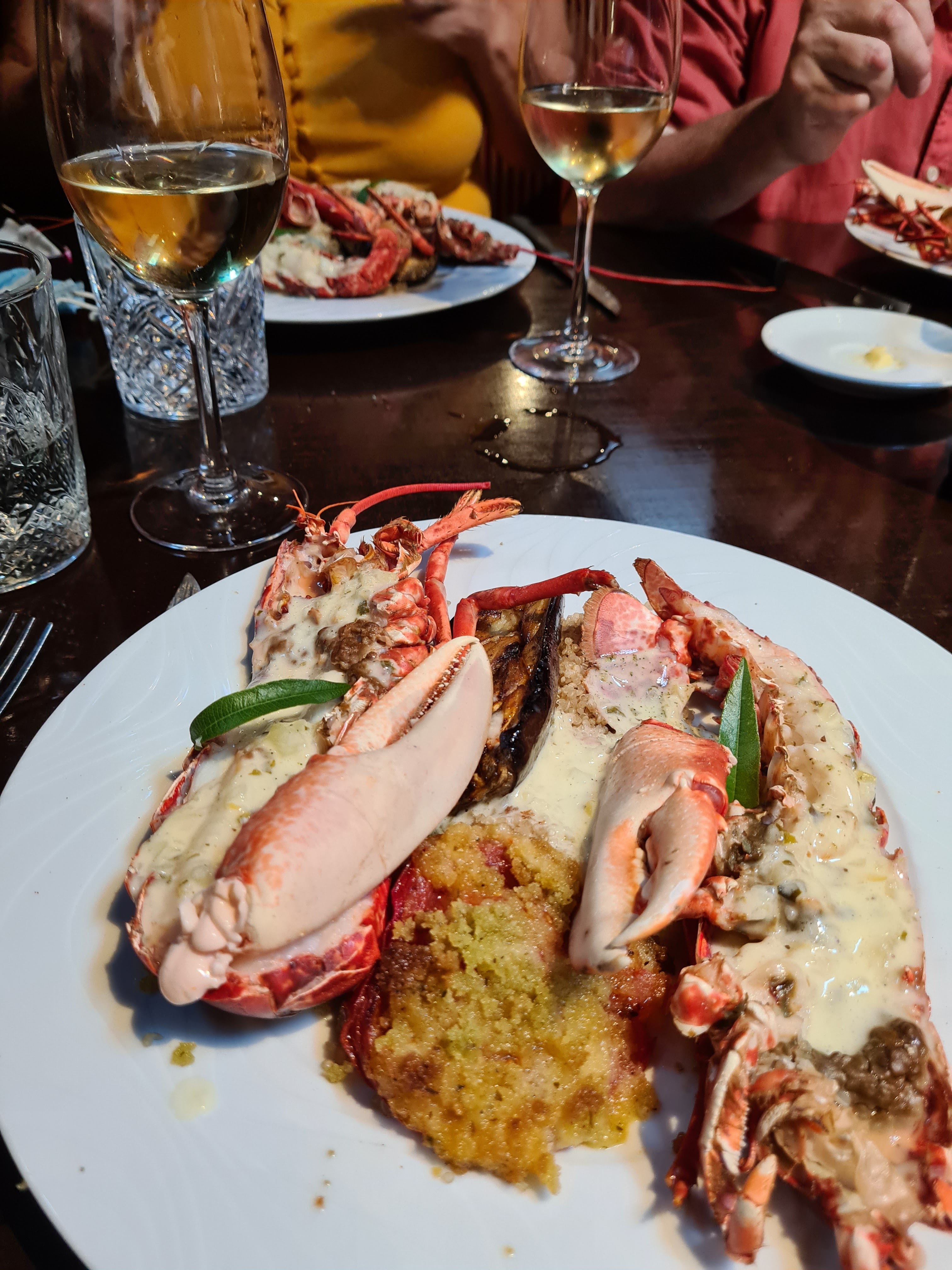 Menu a 49 euro entrée avec deux noix de st jacques avec une sauce potiron la suite soit disan du homard avec du riz vert et de la betterave et le homard pas cuit