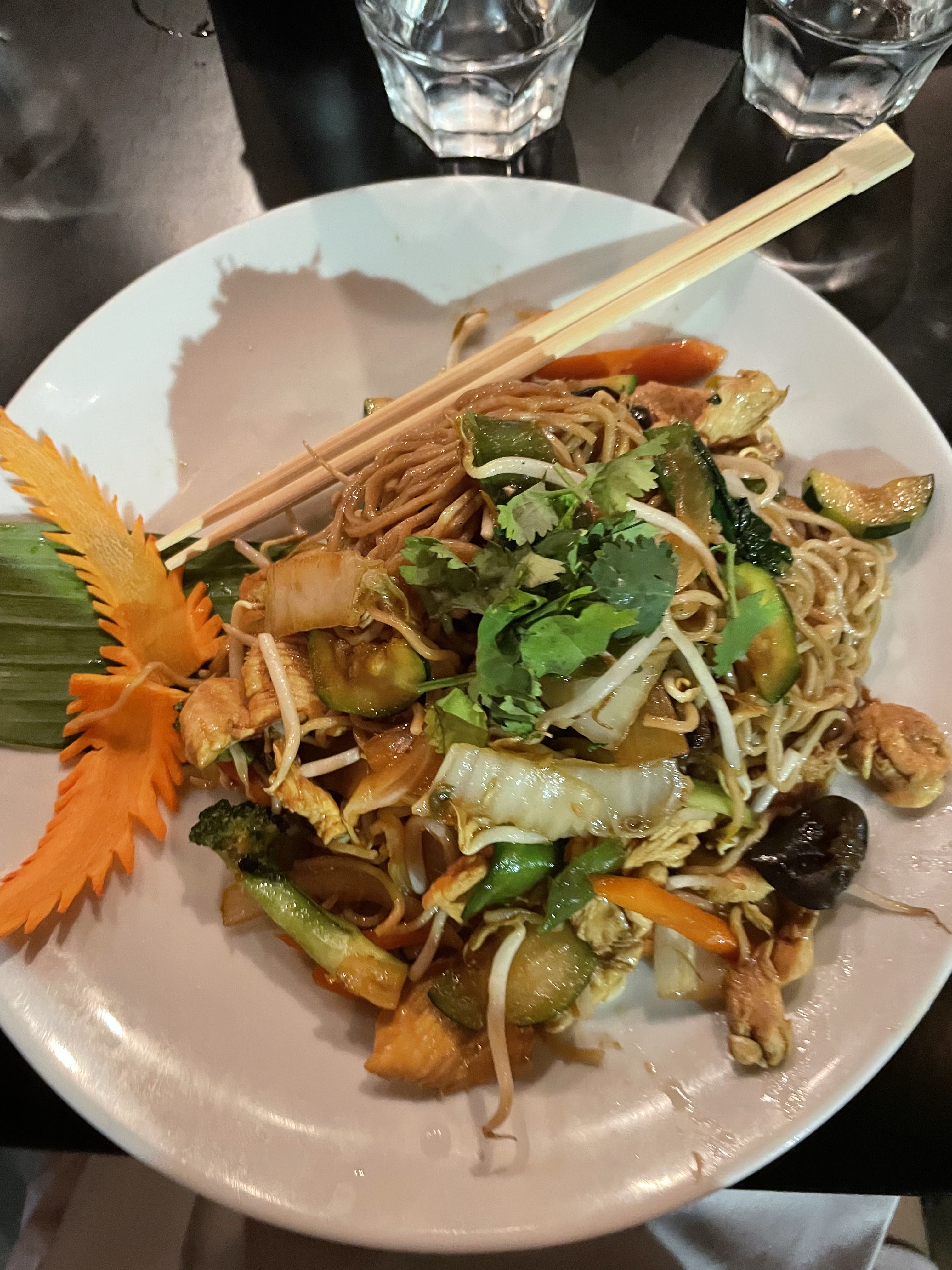 Dîner absolument délicieux ! Le chow mein au bœuf était si tendre que nous avons également adoré les wontons au curry rouge et aux crevettes. Repas parfait après une longue journée de visites au soleil.
