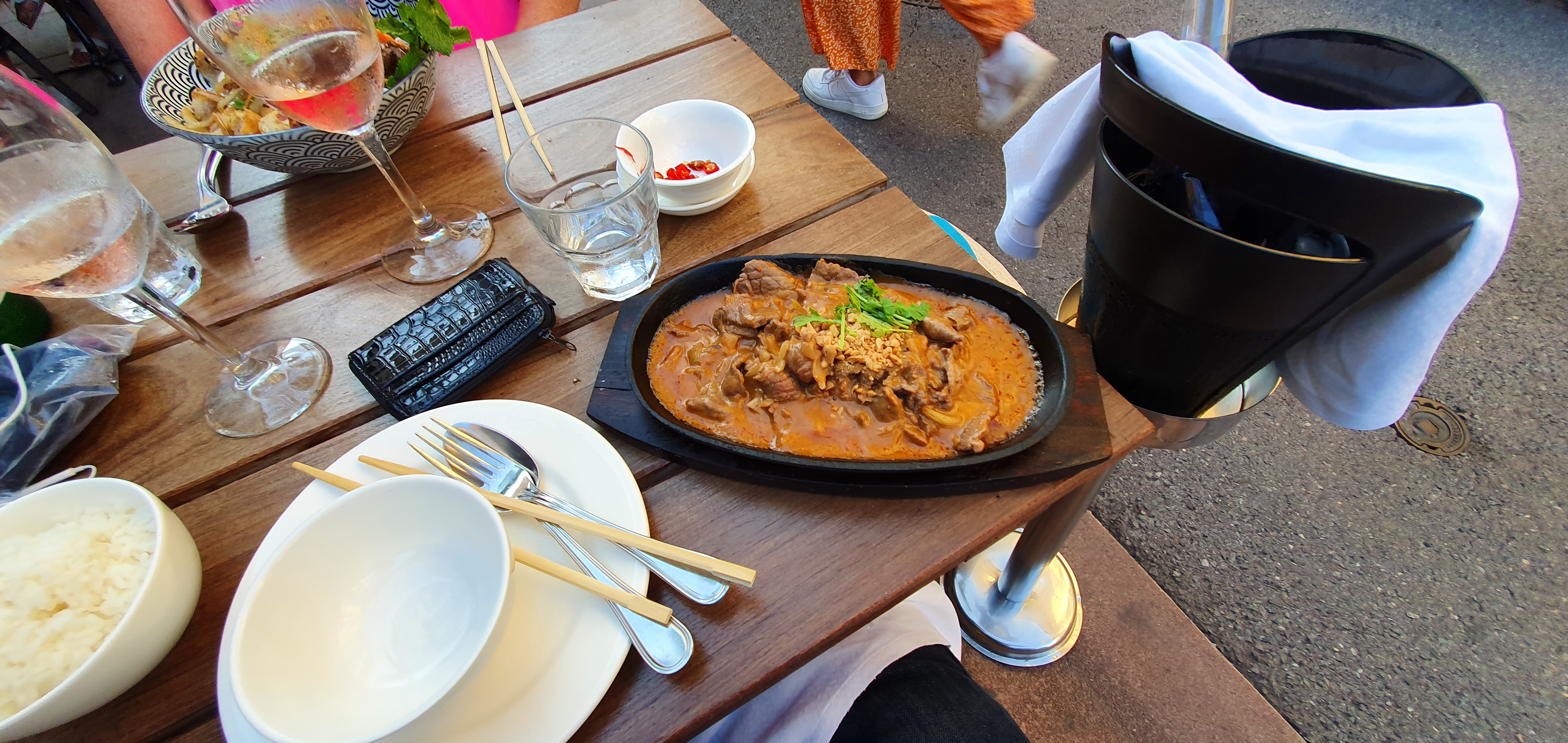 Le restaurant est situé dans le centre touristique et fait en fait une bonne impression, mais : Service peu amical et maussade. Quiconque a déjà apprécié la vraie cuisine thaïlandaise remarquera immédiatement qu’il ne s’agit pas de véritable cuisine thaïlandaise. Le curry rouge, marqué au niveau de piquant 2, n'était ni très épicé ni vraiment bon en termes de goût. C'était plus une sauce à la crème que de la crème de coco. Un peu de poulet et presque pas de légumes. De plus, la nourriture est complètement trop chère et ne vaut pas son prix en termes de goût et de service. Le restaurant n'est pas recommandé.