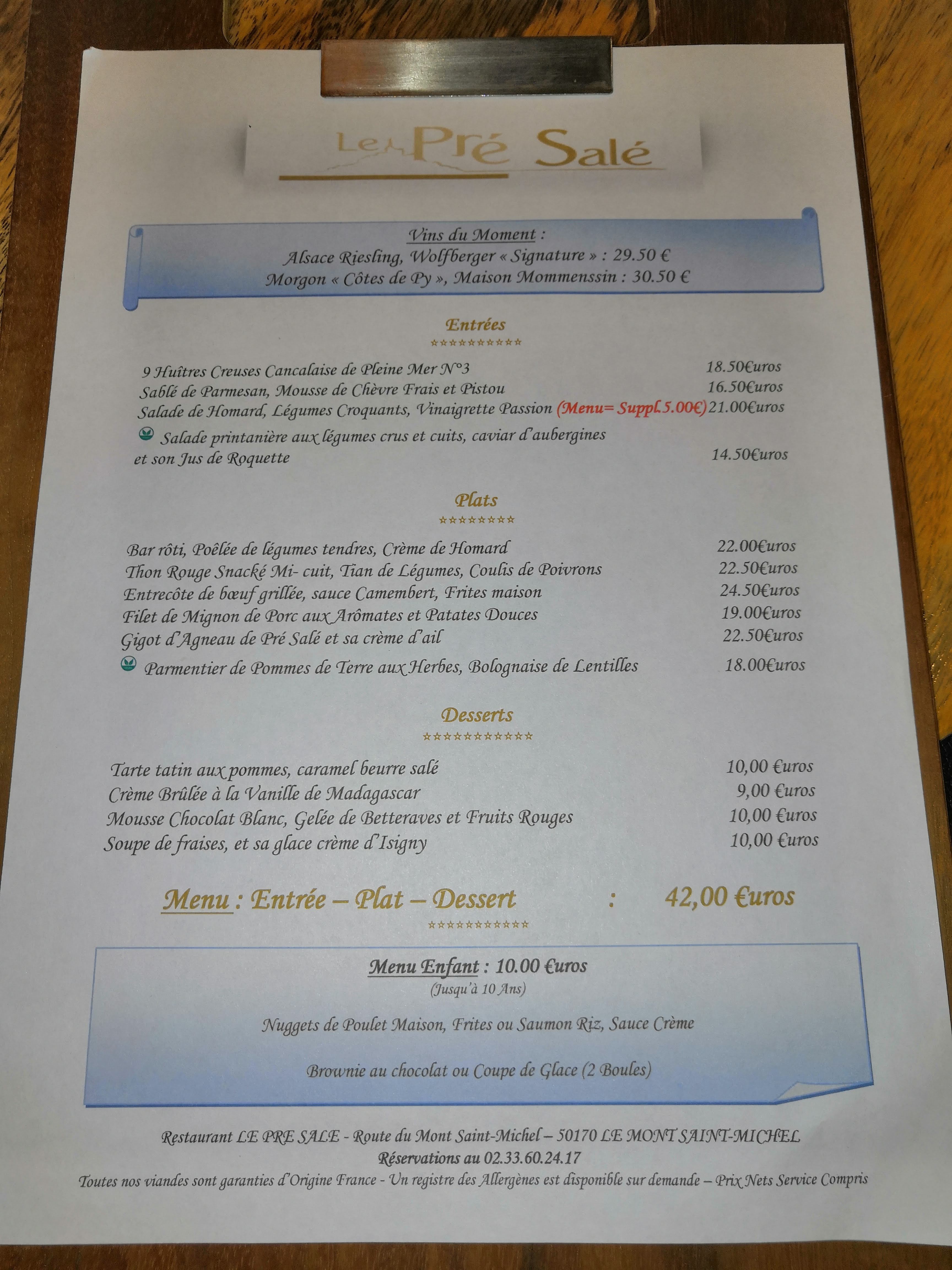 Nous avons pris le menu à 42 euros avec la bouteille de rouge (Beaujolais) à 30 euros. Nous y sommes allées exprès pour goûter à l'agneau pré salé si connu pour son goût naturellement salé iodé. Sincèrement, les morceaux de gigot pré salé étaient bons et généreux mais nous ne l'avons pas trouvé plus exceptionnel qu'un bon gigot cuit à la braise à la maison! Il n'avait pas un goût iodé que j'espérais. Les accompagnements étaient simples: pomme de terre grenaille et purée de celerie rave. Par ailleurs, nous pensions tomber sur un restaurant plutot rustique et c'était tout le contraire, c'était un restaurant un peu trop moderne. Aussi, bien que la cuisine etait bonne, nous ne l'avons pas trouvé si gourmande donc un peu décues. Nous avons dû partir du parking puis revenir pour diner à 19h. Nous avons donc payé 2 fois 15 eur de parking (forfait haute saison), ce qui au final nous est revenue cher pour un diner qui nous a enchanté mais sans plus. Peut être que nous nous sommes fait des films avant de nous y rendre mais quel dommage! Ce sont les raisons pour lesquelles, j'attribue la note de 3 étoiles sur 5.