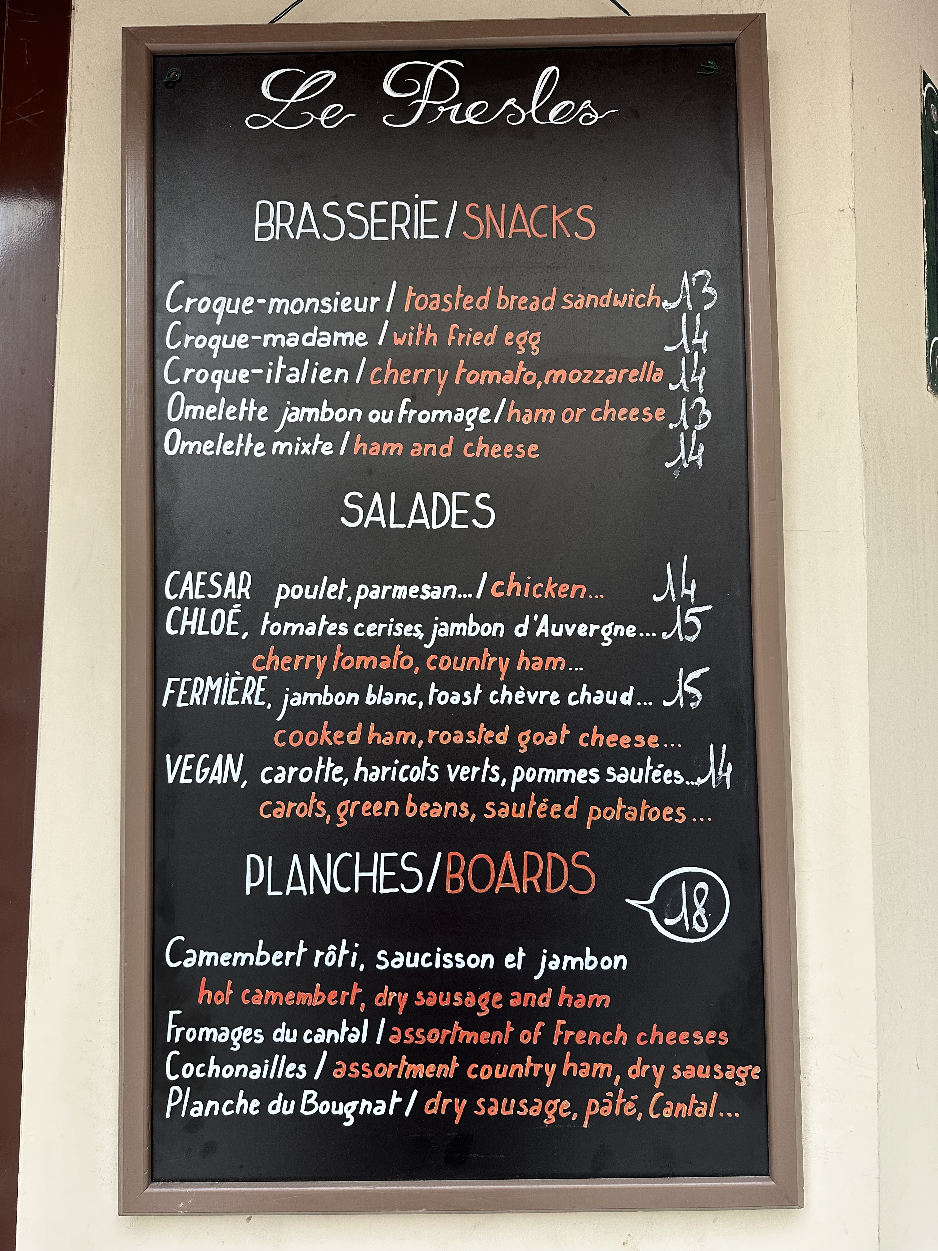 La nourriture au Preles était incroyable. Nous sommes à Paris depuis plus de 3 jours et avons mangé dans des restaurants différents pour chaque repas et celui-ci était de loin le meilleur. La plupart des endroits à Paris (en particulier les attractions touristiques) sont des pièges à touristes qui tentent de s'adresser aux étrangers pour les attirer. Cet endroit est un peu hors des sentiers battus mais très authentique. Ils n'ont qu'une poignée de plats principaux mais ils les ont tous perfectionnés. C’était aussi le premier endroit où nous, Américains, nous sentions accueillis comme plus qu’un chèque de paie. Ils étaient très gentils et n’ont pas été déçus que nous ne parlions pas français. Lawrence, l'un des membres de la famille propriétaire du restaurant, est venu et s'est assuré que tout était parfait. Nous l'avons remercié et lui avons posé une question simple sur la prochaine étape. Il s'est gentiment assis avec nous pendant environ 20 à 30 minutes en nous donnant des indications, en nous recommandant des choses à faire et à ne pas faire et en nous faisant un bref tour de la ville sur notre carte. L'une des meilleures expériences culinaires ainsi que le meilleur service non seulement dans cette ville mais dans toutes les villes où je suis allé. Merci Lawrence et Le Presles.