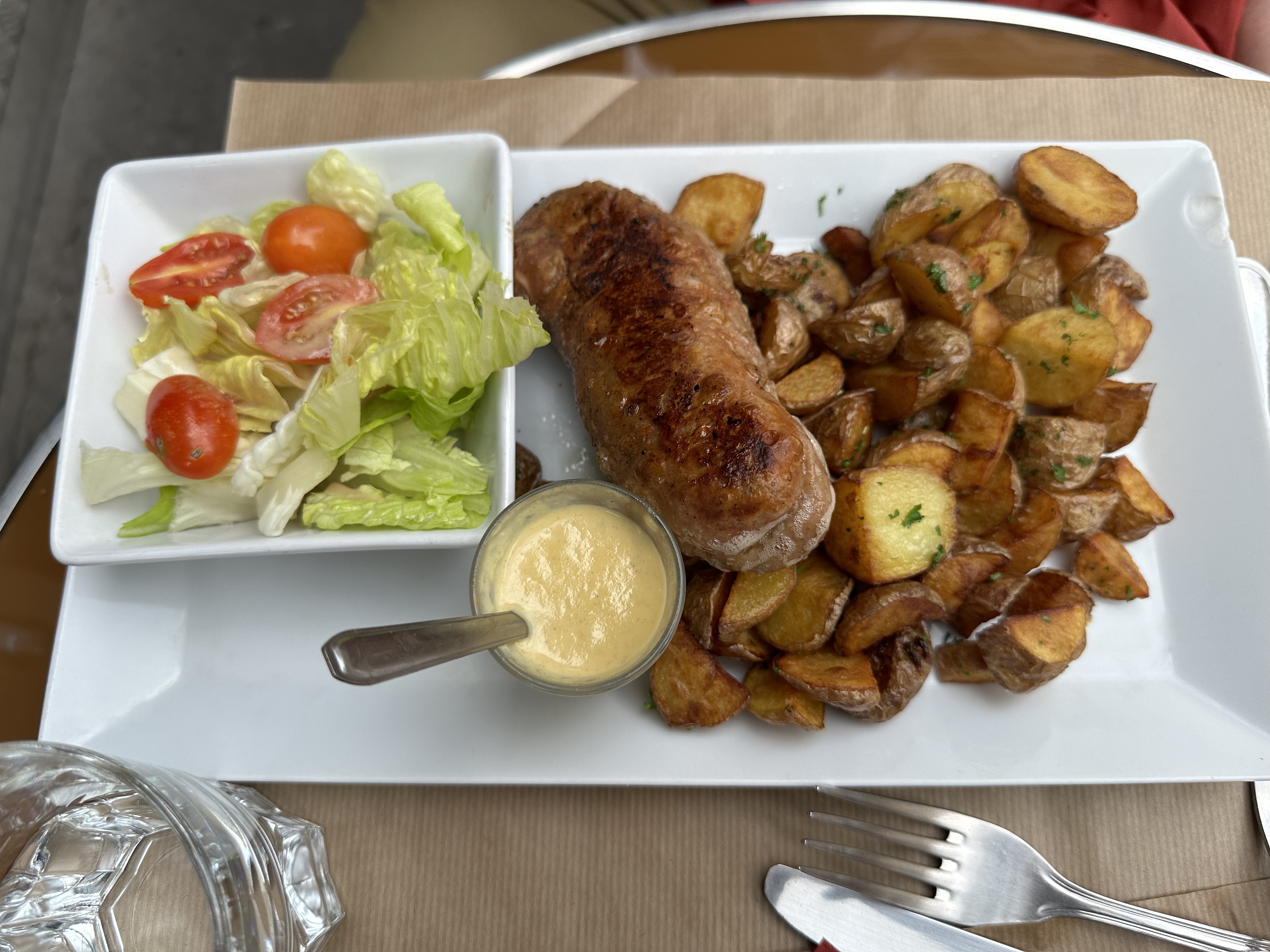Déjeuner qui commence par un sympathique Muscadet pour arroser une douzaine d'huîtres d'Isigny puis une andouillette bien grillée, un délicieux chèvre et une très bonne mousse au chocolat à peine trop sucrée et café. Cadre agréable et accueil chaleureux.