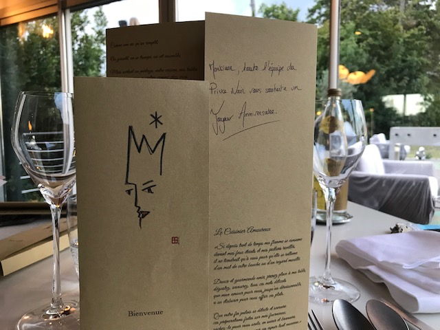 Menu unique en fonction des produits. Aucune table n'a d'ailleurs le même repas – ce qui peut être frustrant. Heureusement, la cuisine est aussi à l'écoute des vœux du client. Tartelette aux champignons sauvages. Magnifique ris de veau grillé à l'unilatéral, avec un second service en sauce grand mère. Dessert à la poire et aux algues bien équilibré. Carte des vins à la fois riche et raisonnable dans ses prix – ce qui n'est pas fréquent chez les restaurants étoilés de la région. Très bon Château Durfort Vivens 2015.