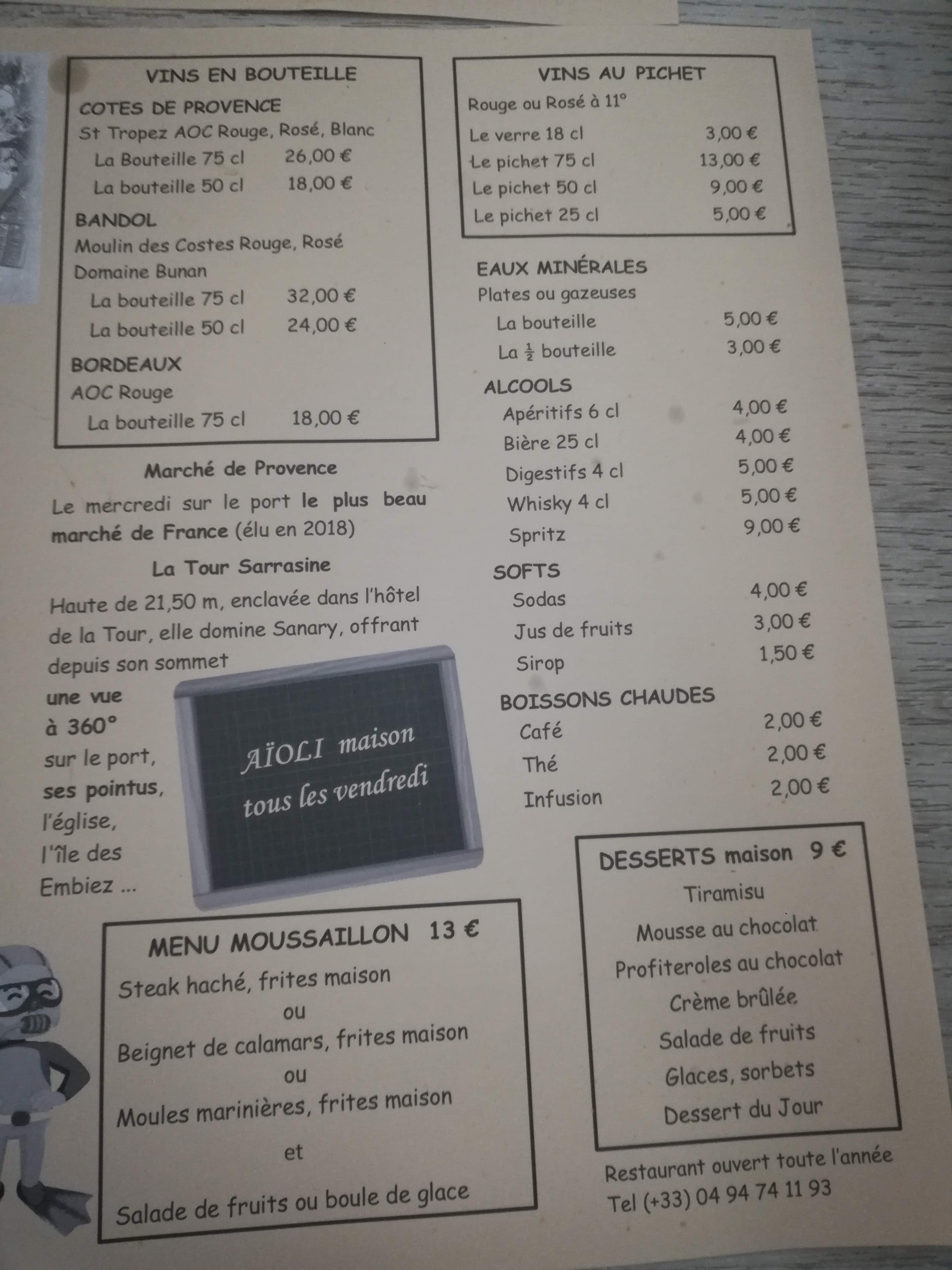 Nous sommes allés deux fois dans ce restaurant pendant notre séjour à Sanary sur mer. Accueil sympathique et même chaleureux. Première fois, moules frites excellentes avec en dessert 2 tiramissus et 1 profiterrole.. la deuxième fois, assiette de la mer très copieuse et pour mon mari et mon fils côté de bœuf, cuisson parfaite, ils ont eu du mal à finir leurs assiettes. Dessert tiramissus et salade de fruits toujours extra. Je recommande ce restaurant, c’est le meilleur que nous ayons fait à Sanary.