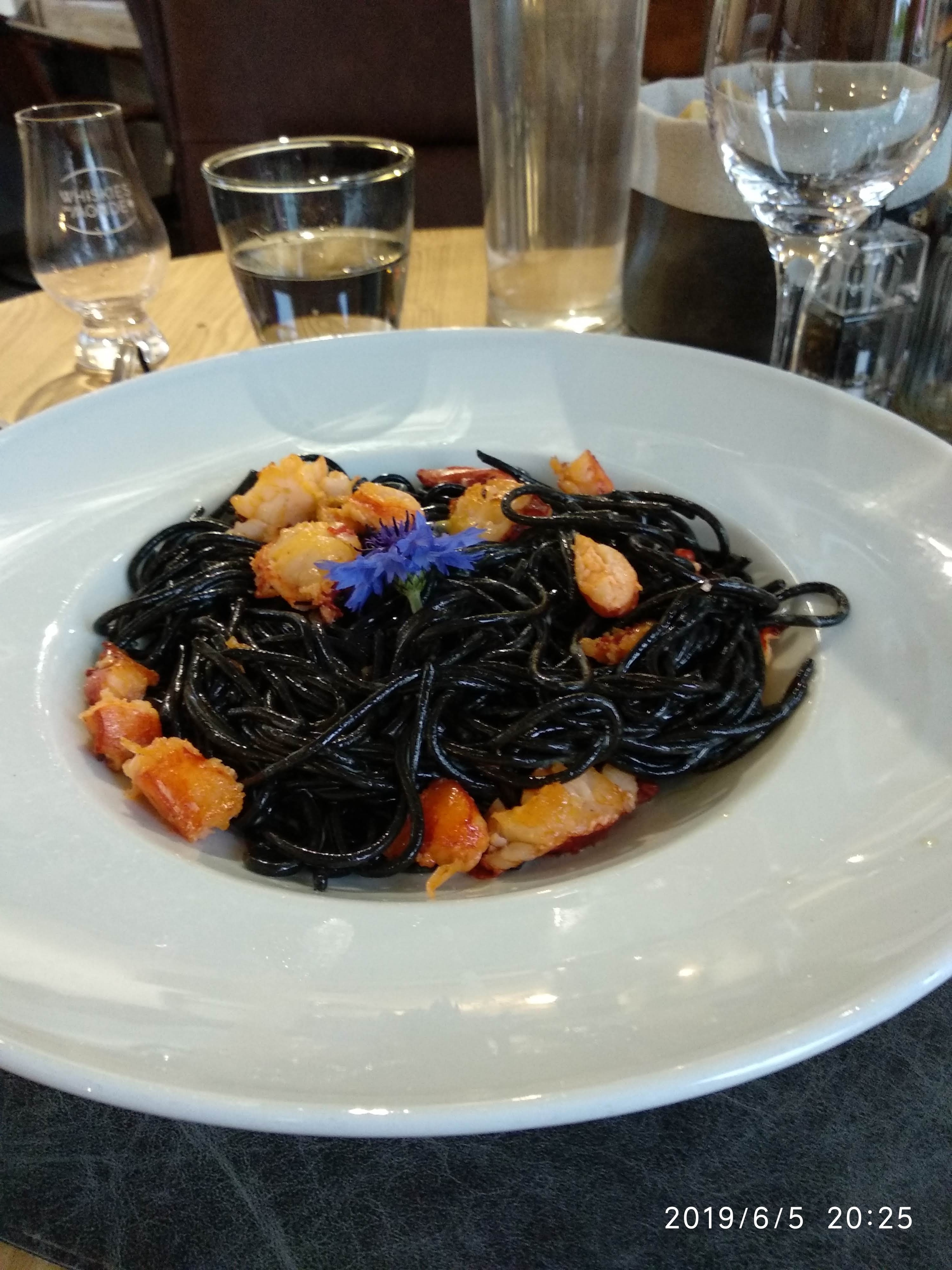 Très très bon Des menus à 24 et 32€ très alléchant Un homard maître de hôtel avec de l’encre de sèche succulent : on vous présente votre ami vivant avant la cuisson preuve de fraîcheur