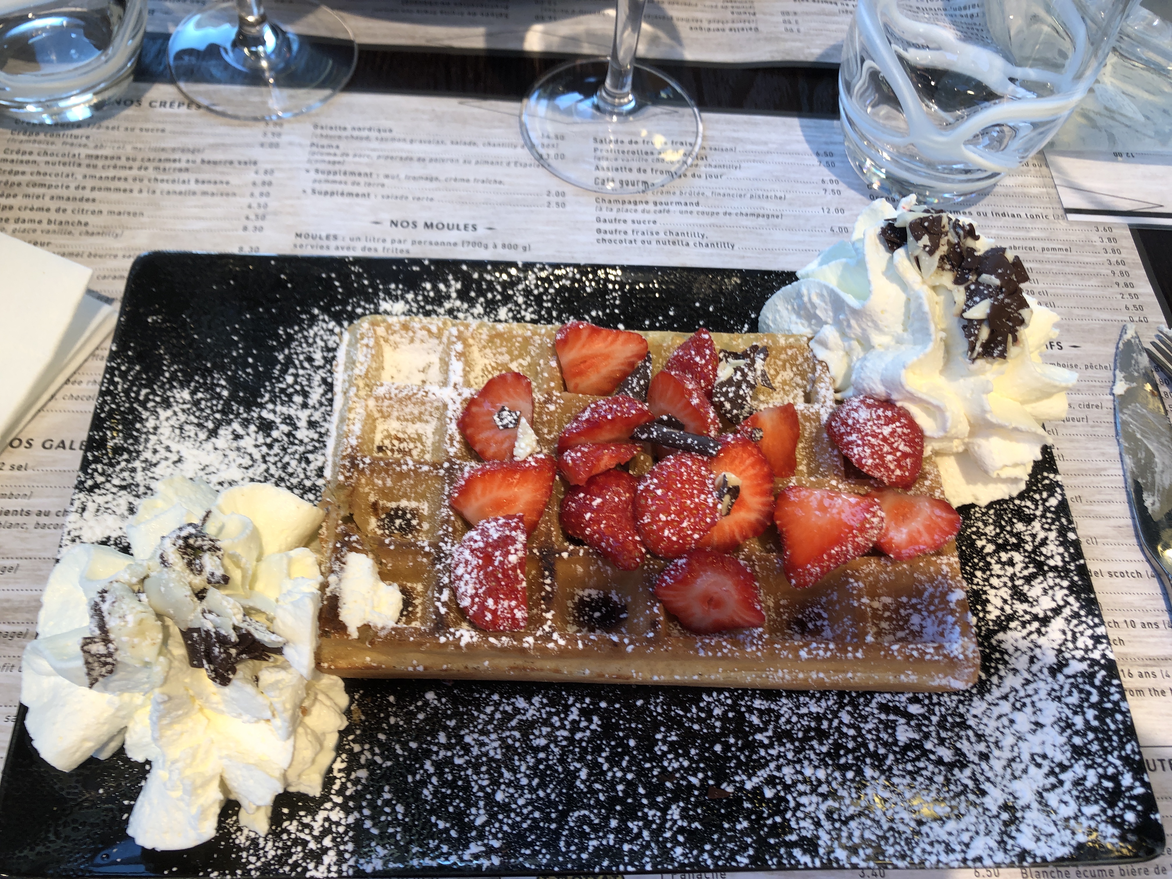 Un repas en amoureux après un séjour de 5jours .tout prêt de notre location, nous y sommes allés à pieds,moule frites pour Mr et moi galette au saumon, Glace pour Mr et moi galette au beurre.je recommande et galette bien garni et bonne portion de moule,on a mangé en extérieur pour une soixantaine d'euros et sommes repartis avec le restant de la bouteille.. proposé par eux si on finissait la btlle