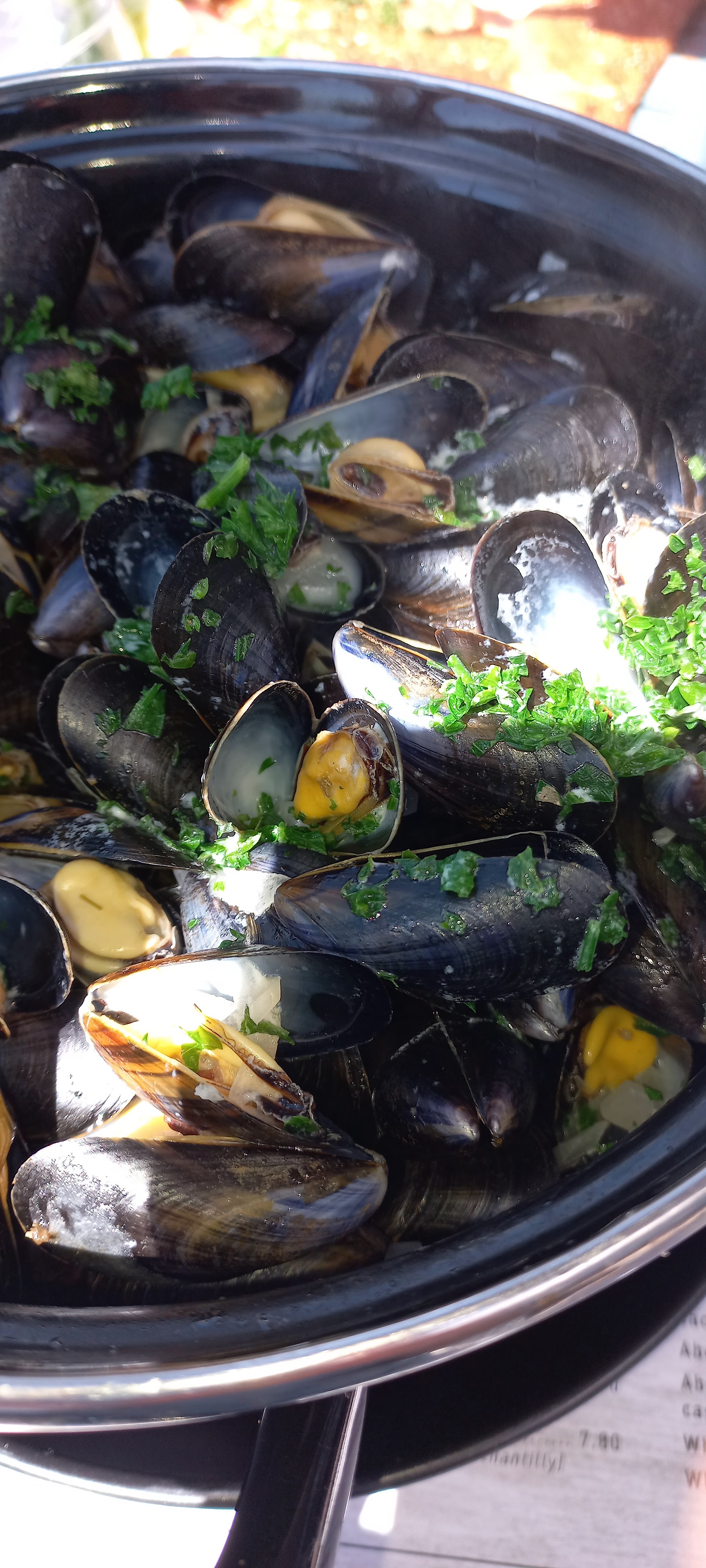 Moules pratiquement immangeables, mal cuites. Pas pu les manger, entièrement . d autres tables se sont plaint. La patronne nous offre le vin pour se rattraper Ne prenez pas ça. Par contre dessert délicieux et personnel aimable
