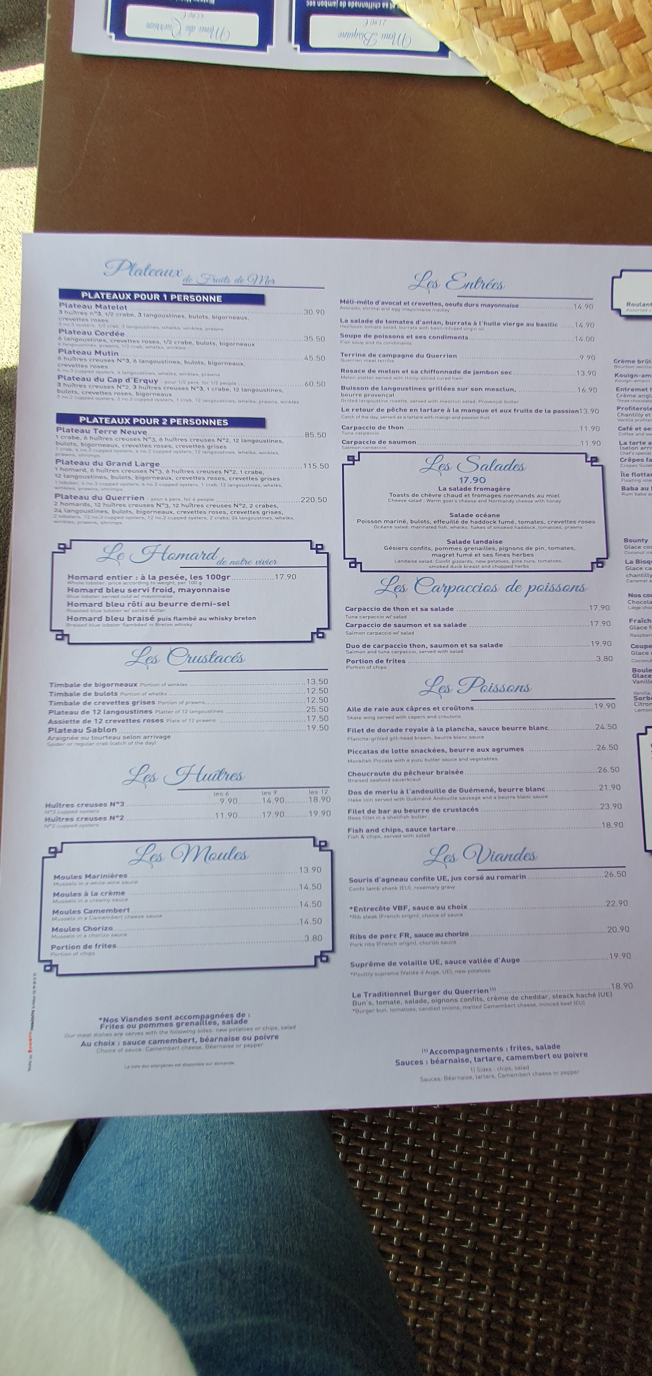 Nous avons très bien mangé au Querrien, Bon rapport qualité prix. Très beaux plateaux de fruits de mer à des prix abordables. Serveuses et patron souriants et agréables. Ok chiens, gamelle d'eau proposée.