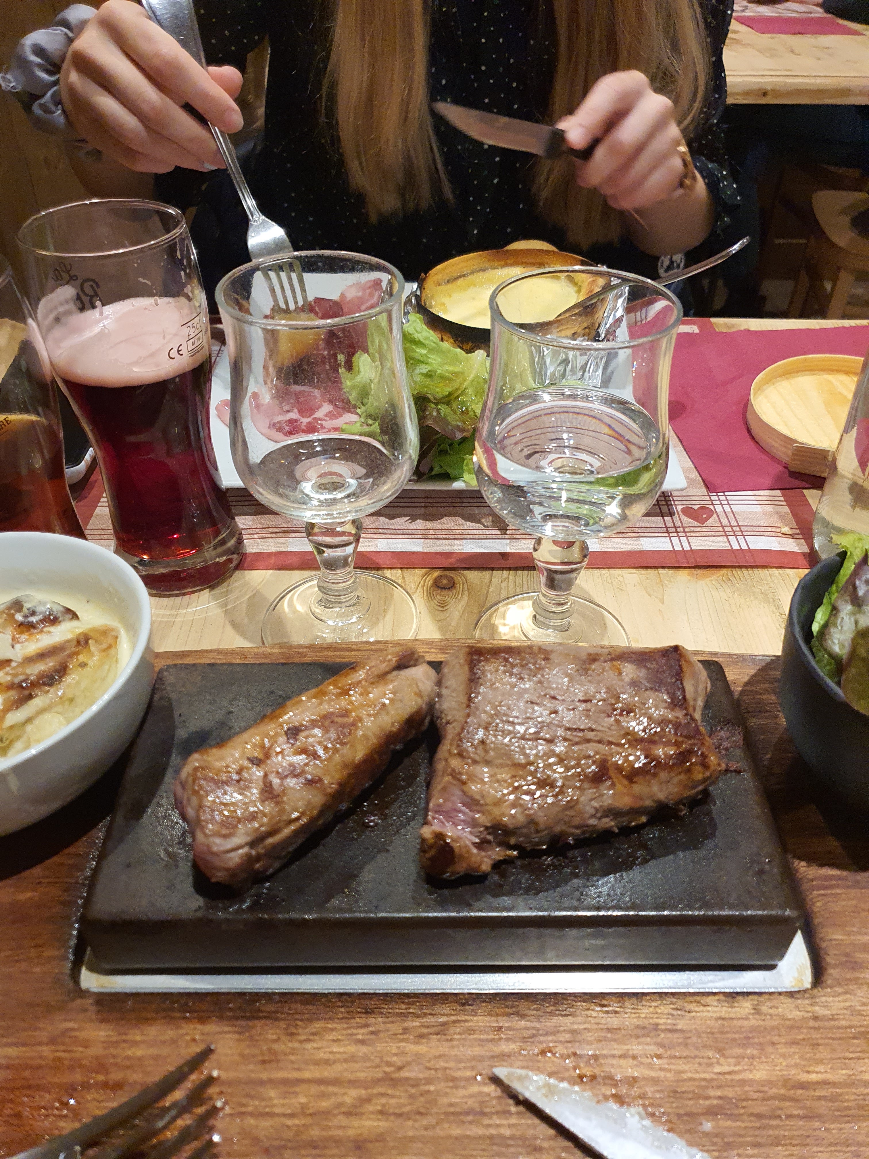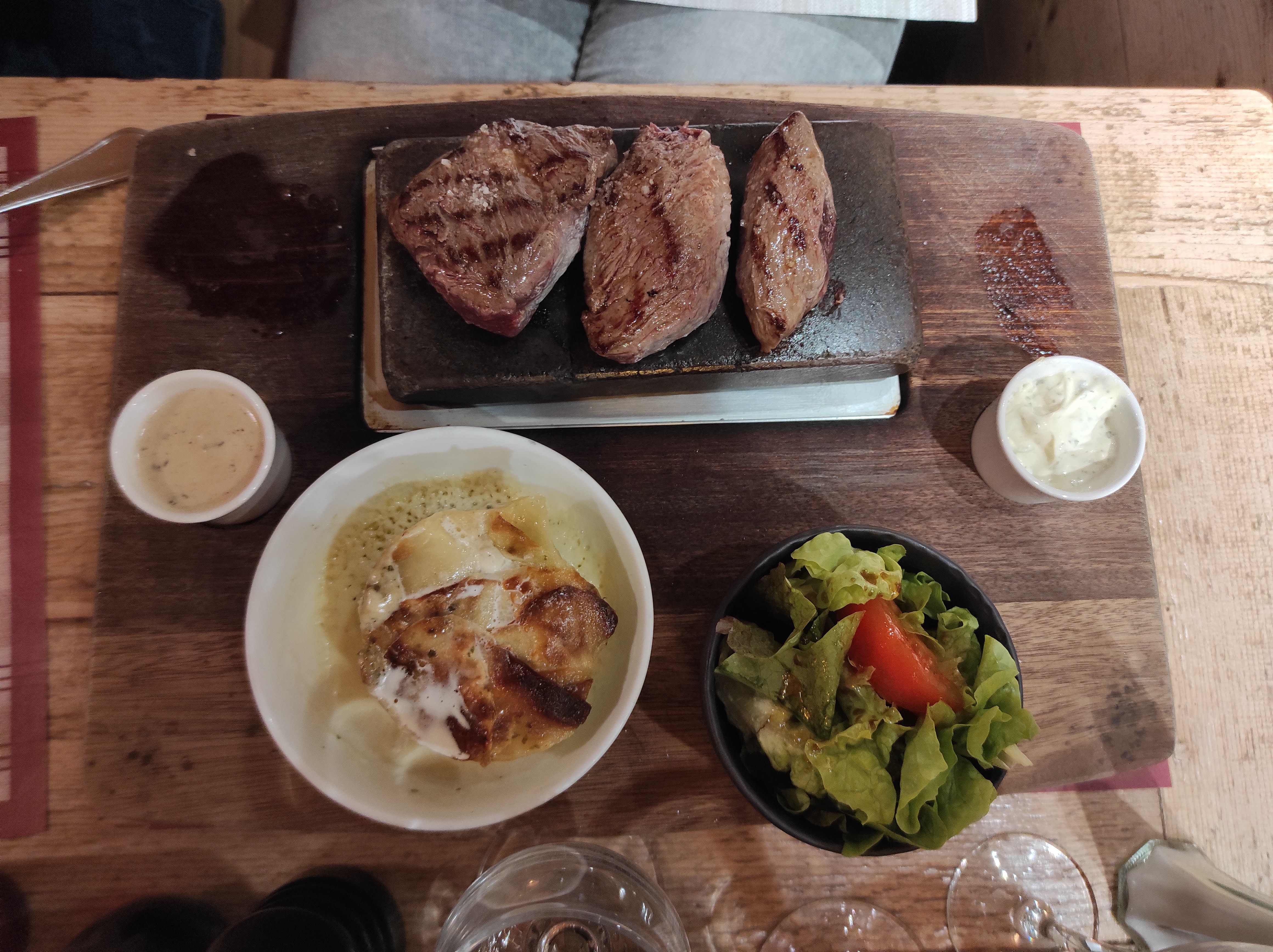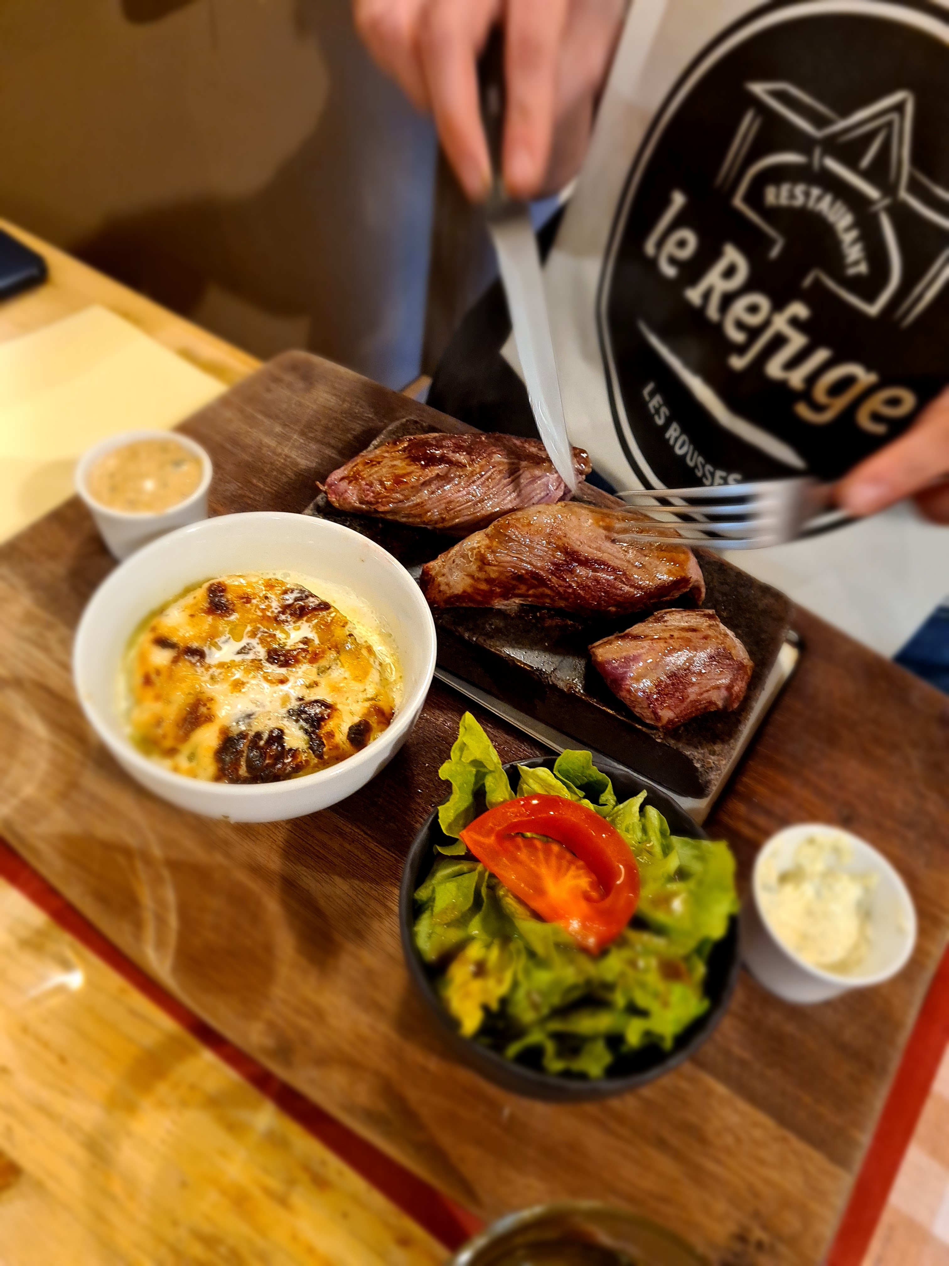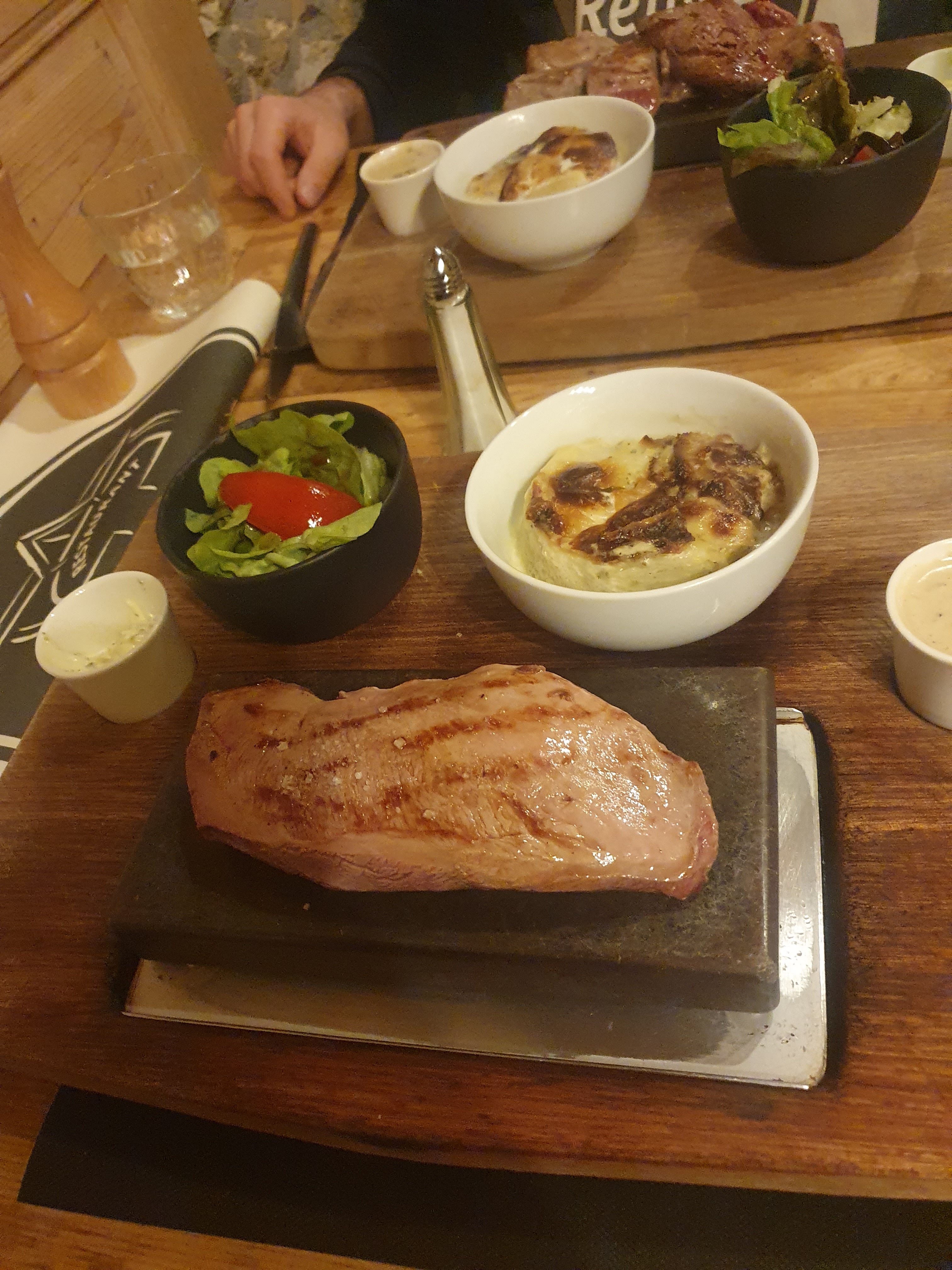 Enchantés....cadre intérieur magnifique en pierres et bois, le filet de boeuf sur pierrade accompagné d'un gratin dauphinois maison est un délice. Service irréprochable malgré une tres forte affluence. A recommander vivement