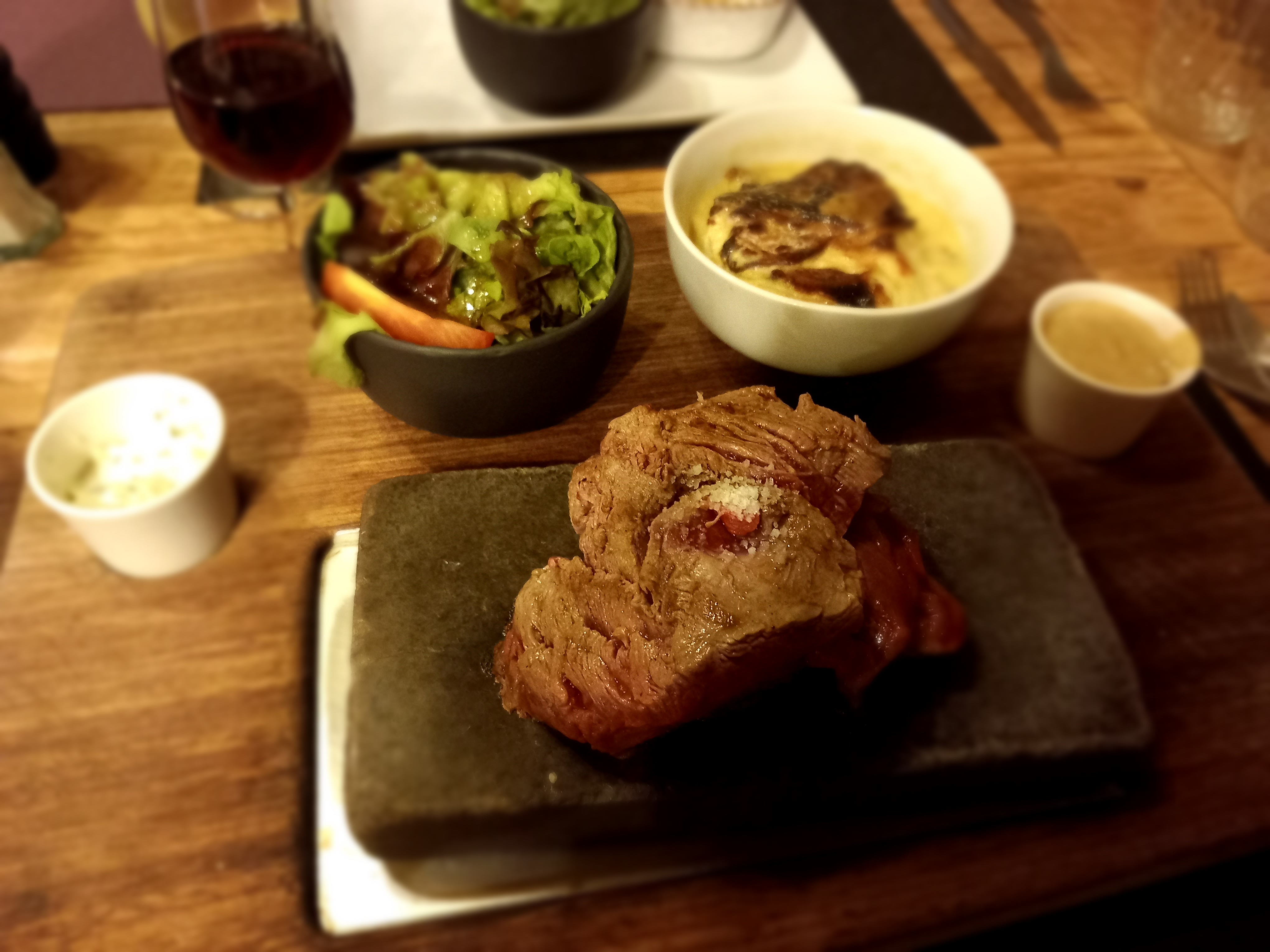 Nous étions assis dans la petite salle à droite de l'entrée. L'ambiance était chaleureuse, le service sympa et les viandes sur pierre très bonnes (nous avons pris le duo). Bon choix de restaurant pour notre petit week end.
