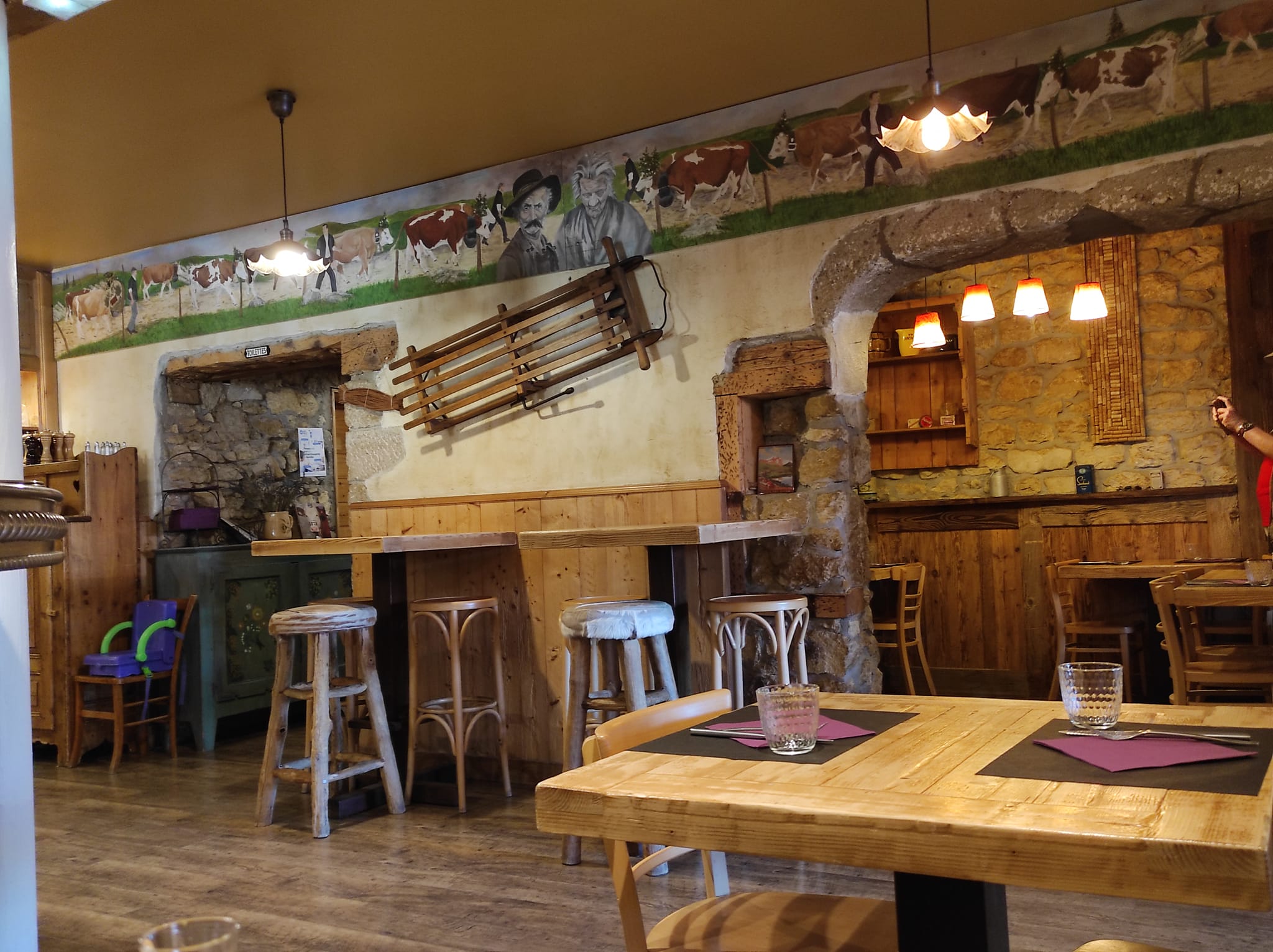 Dès la porte d'entrée vous plongez dans l'ambiance de la montagne jurassienne entre bois et objets anciens. Accueil chaleureux, fondue royale suisse délicieuse et copieuse, service rapide, personnel souriant. Parking à proximité.