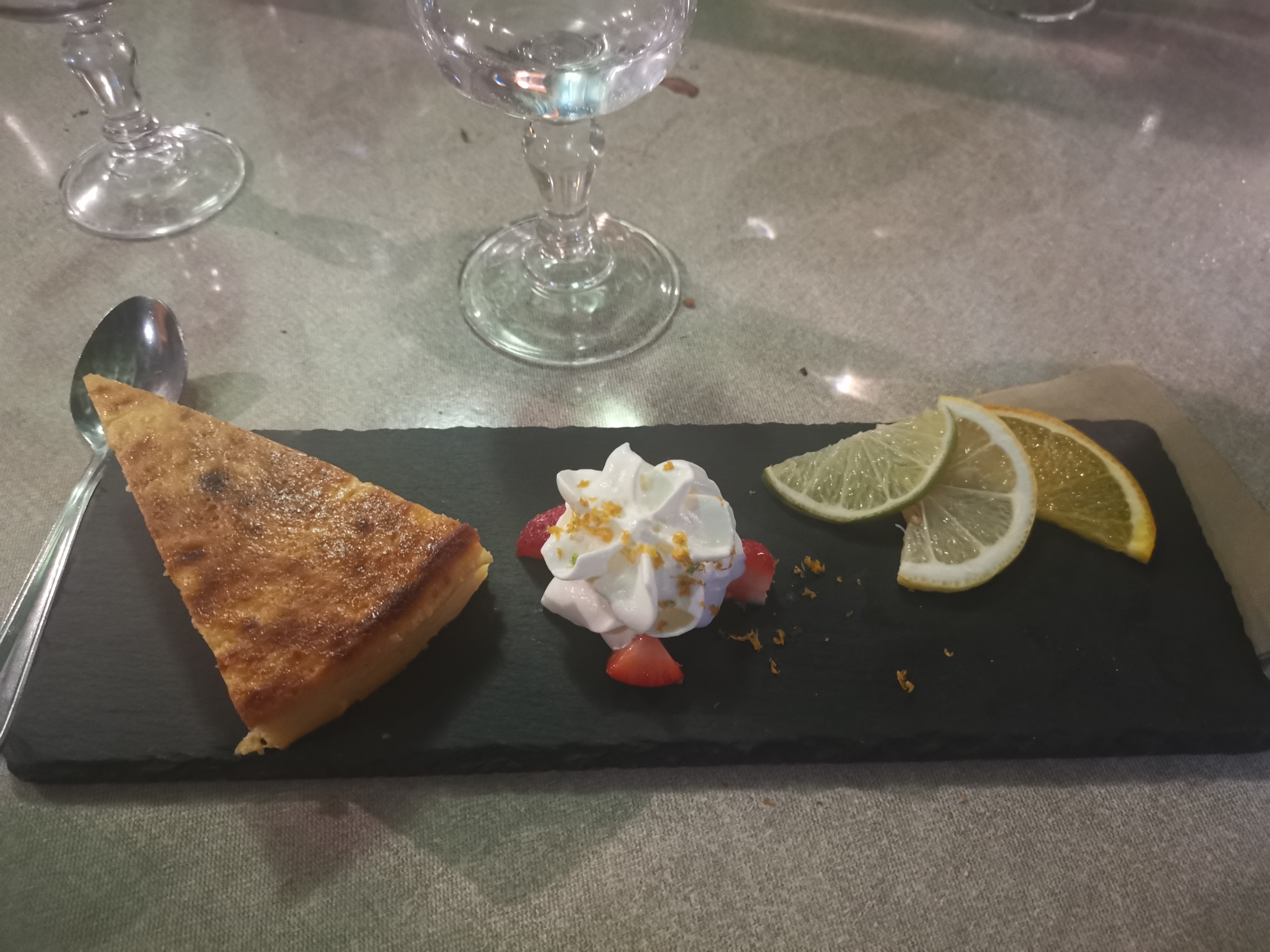 Nous arrivions de Lévie à pied. Donc l'estomac dans les talons. Une bouteille de rosé plus tard et un sauté avec des patates au four tout allait bien mieux...... Ambiance sympa ,service au top et gîte parfait.