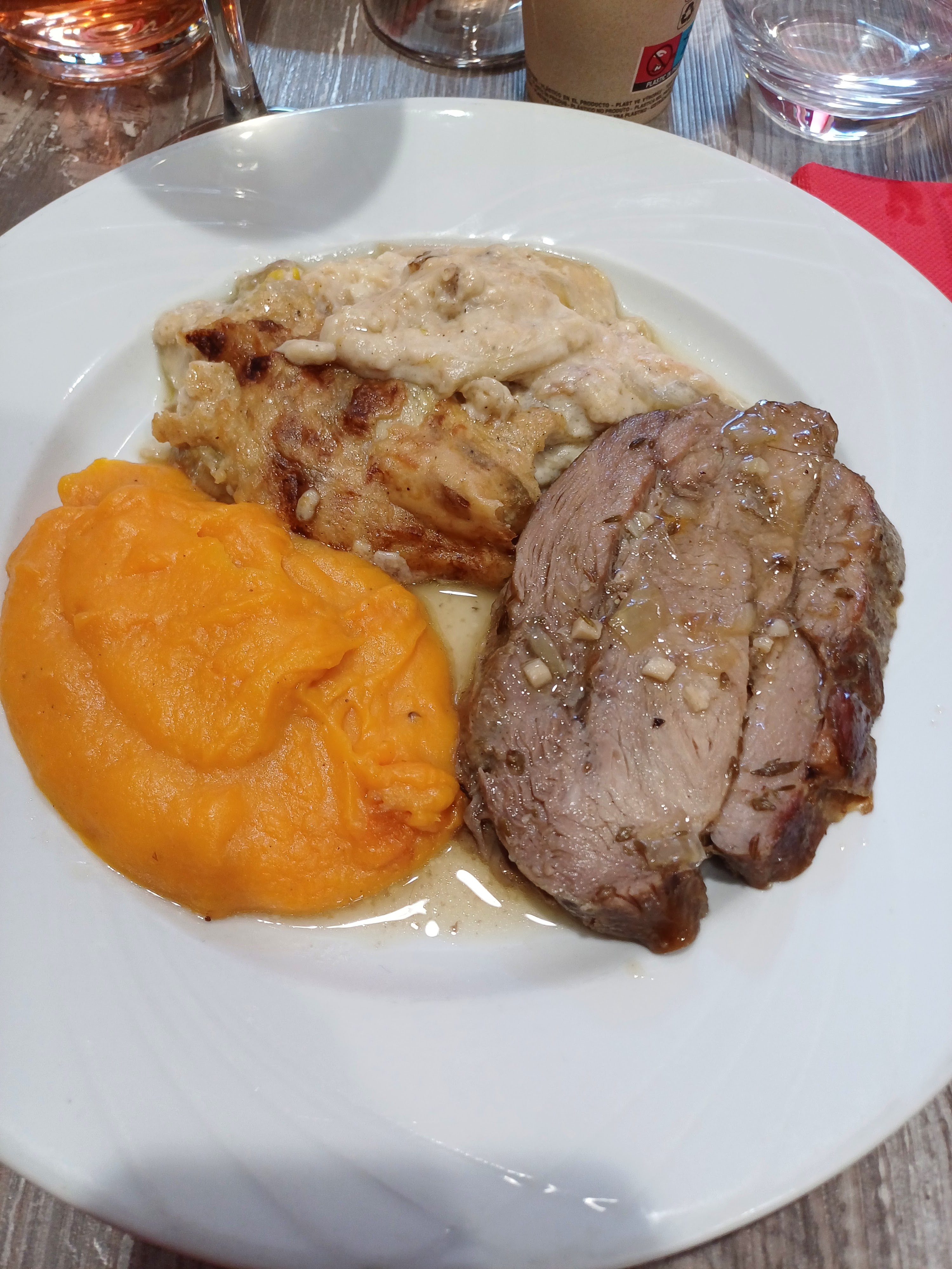 De passage en vélo. Personnel à l écoute. Plat du jour sauté veau/olives et dessert tarte chocolat et boule framboise tout à fait correct pour 13,60€.