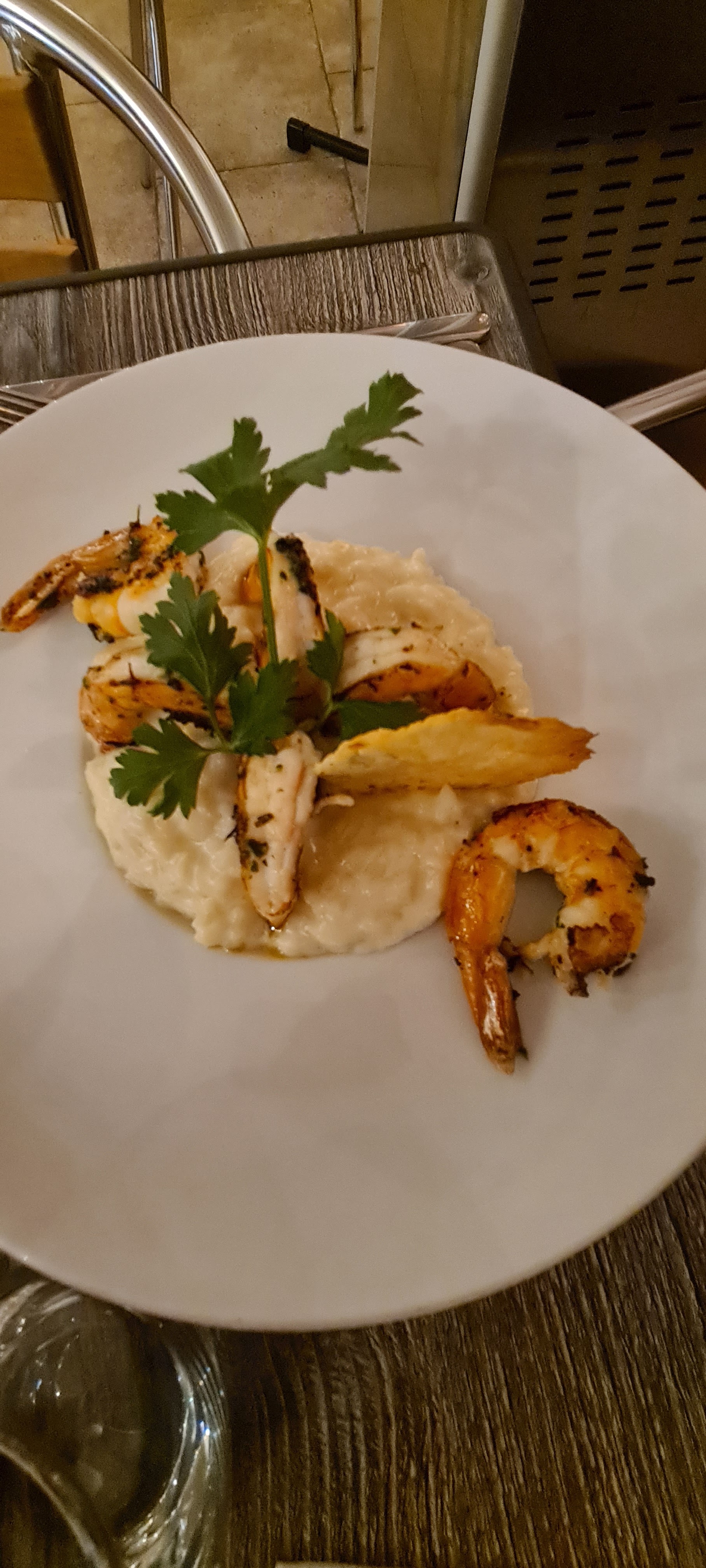 Personnel sympatique, plat d'un tres bon rapport qualité prix, on y a déjeuner 2 fous cette semaine. On c'est régaler chaque fois ! Planche de charcuterie /fromage a partager. Les gambas 👍 on a aussi pris goûter la salade de poulpe et l'escalope milanaise (on garde l'adresse en tête pour nos prochaines visites aux saintes)