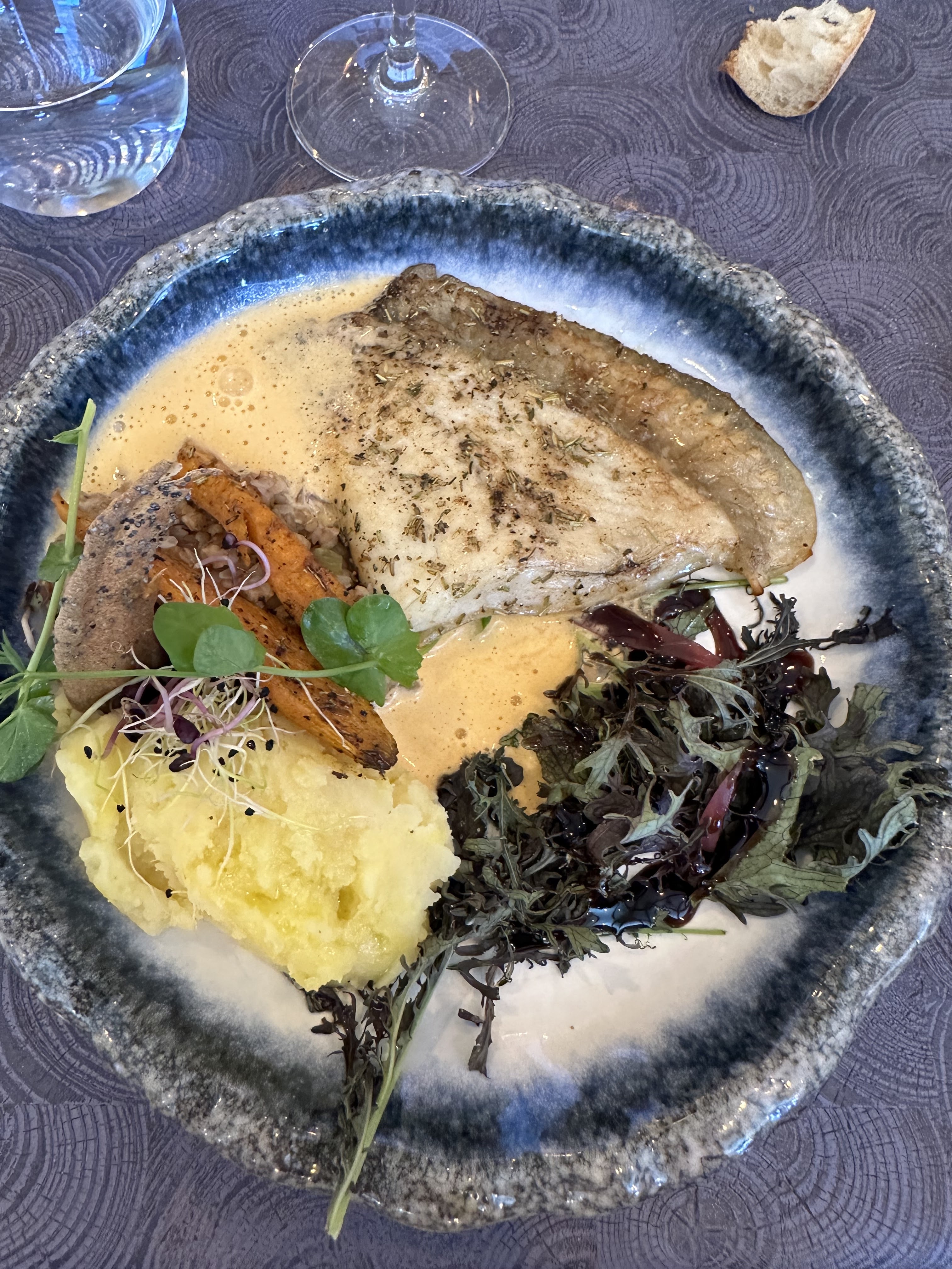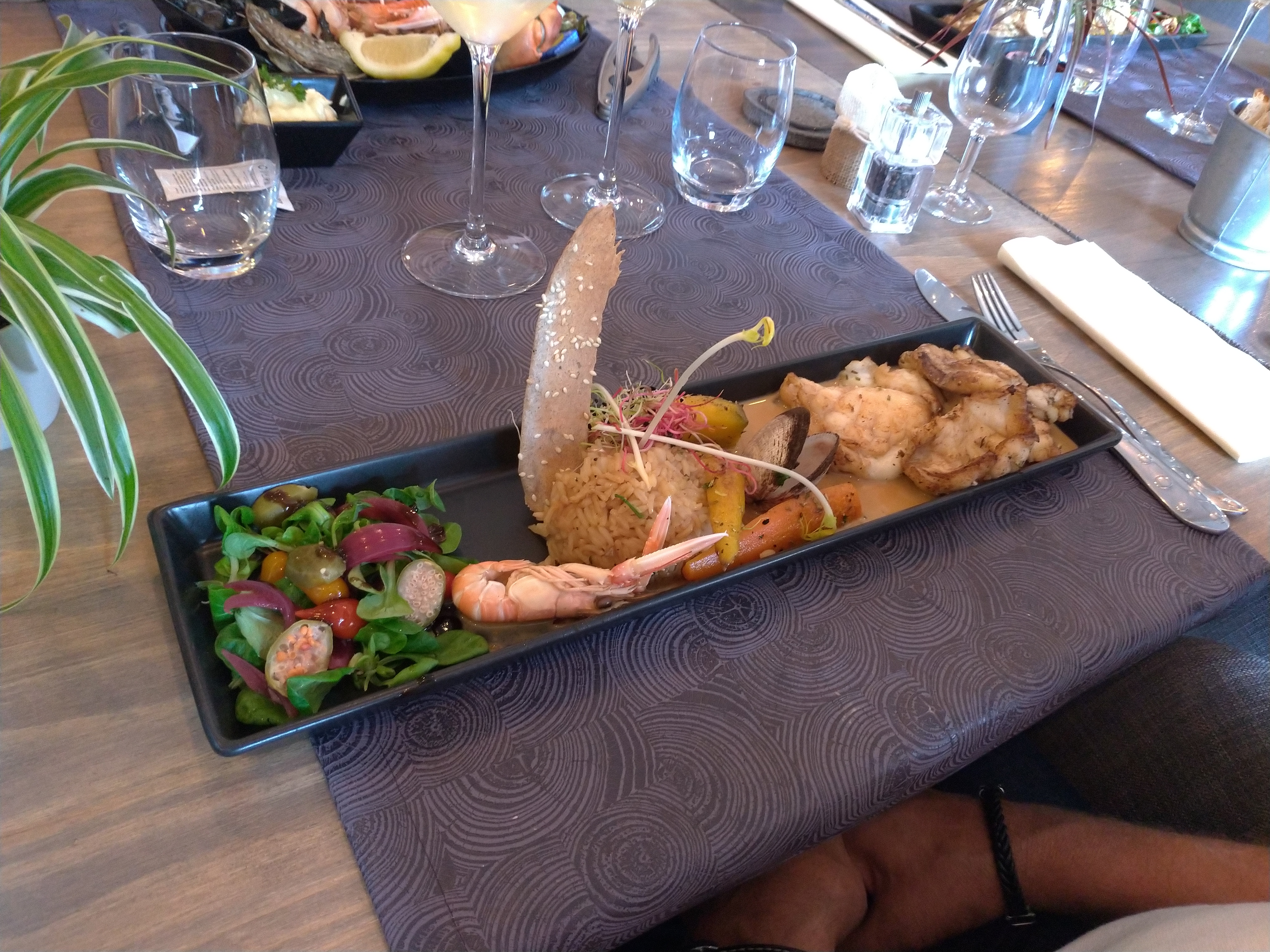 Cuisson merlu et lotte parfaite. Belle presentation des plats. L'accompagnement mériterait d'être en plus grande quantité. L'assiette de fromage est vraiment limite : 3 mini morceaux pour 9€ ! Rapport qualité prix trop élevé. Terrasse très belle et très bon service