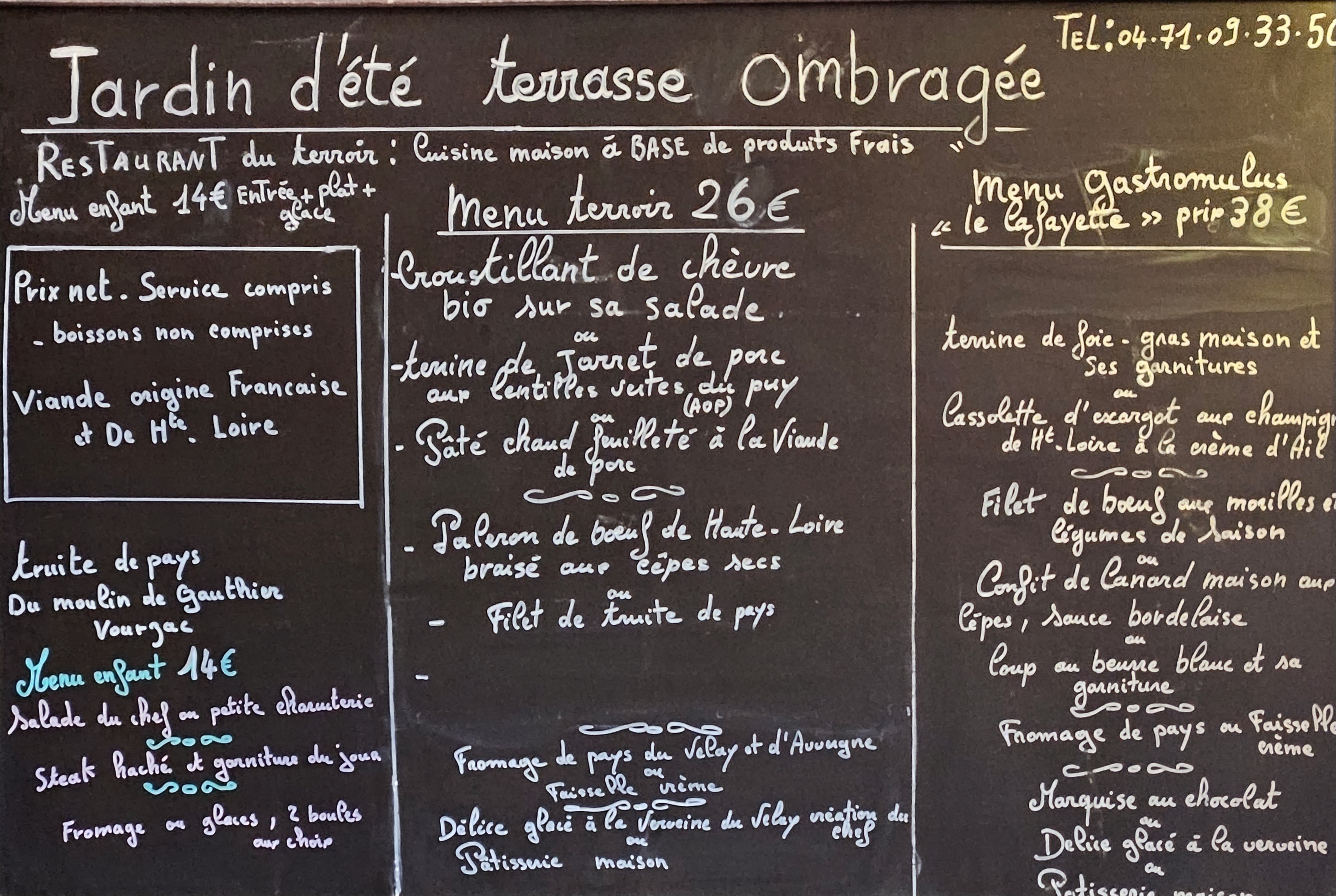 Très bons menus avec des produits frais, locaux. Une viande de la Haute Loire très tendre accompagnée de morilles...un délice Excellent accueil Bon rapport qualité prix