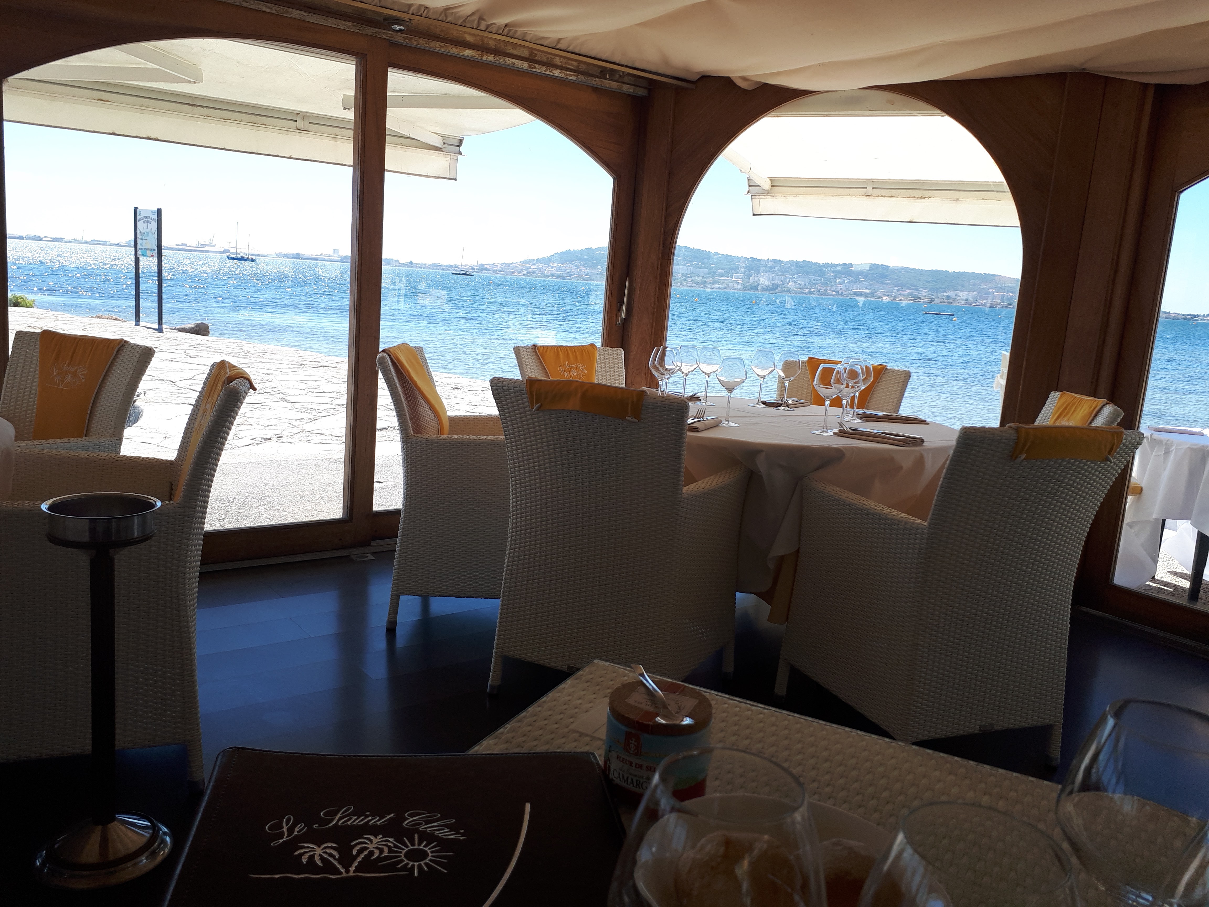 Le Saint Clair ce n’est pas clair. Nous nous sommes présentés avec un coffret cadeau pour 2 personnes(valeur 70€,photo ci-jointe)offert par notre fille. Nous pensions que tout était compris comme sur descriptif ci-joint. La dame qui nous a accueillie nous a dit que le kir,le vin et le café était en supplément à notre grande surprise. Enfin nous avons quand même passé un excellent moment avec un bon emplacement en bordure de l’étang de Thau avec une jolie vue sur Séte et le Mont Saint-Clair.