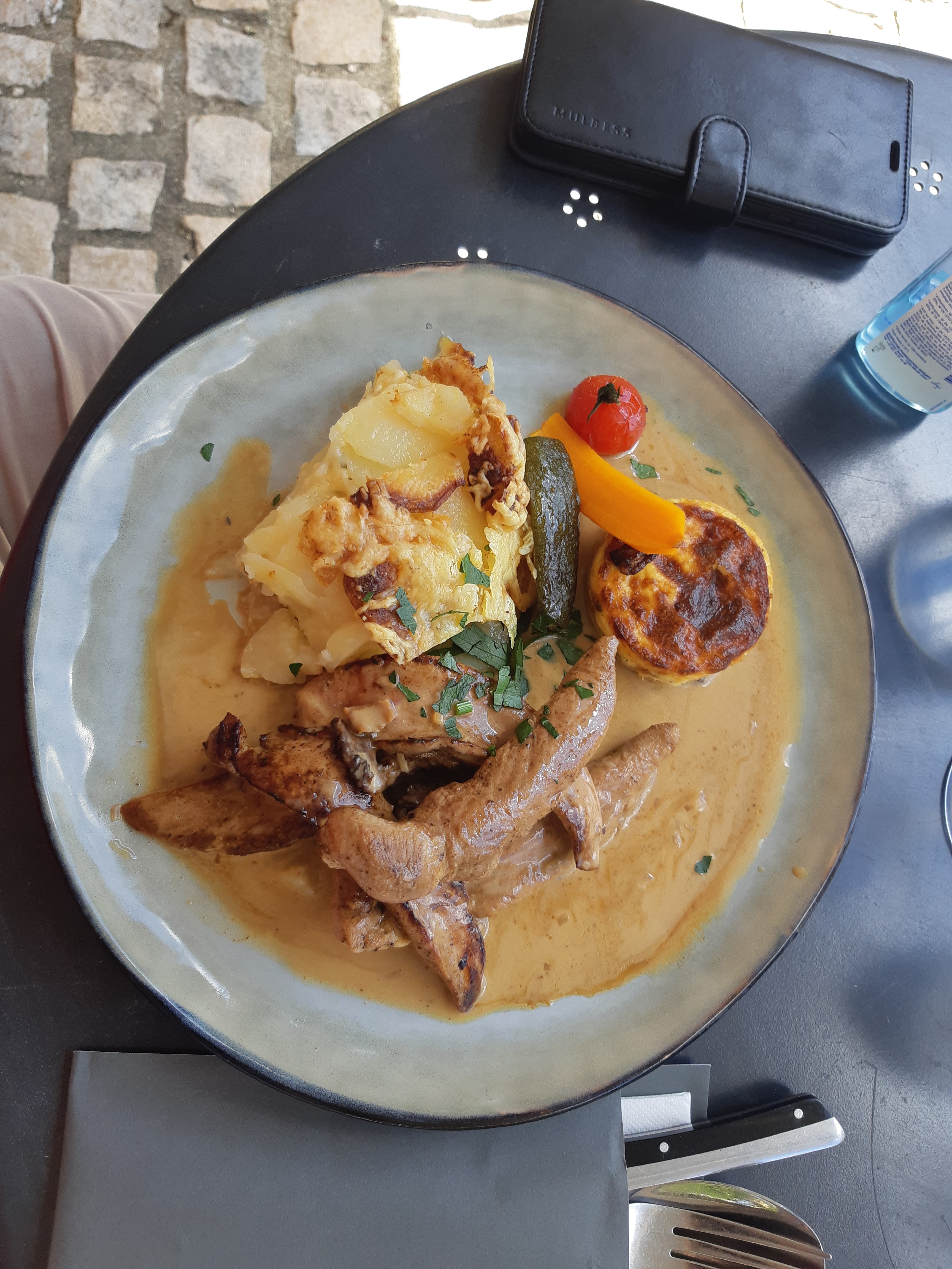 Satisfaits du lieu, de l'accueil, même avec un chien, avons choisi le menu à 19€ entrée, plat, dessert ou fromages. C ' est bon, c'est frais et cuisine du jour. Impeccable. Merci.
