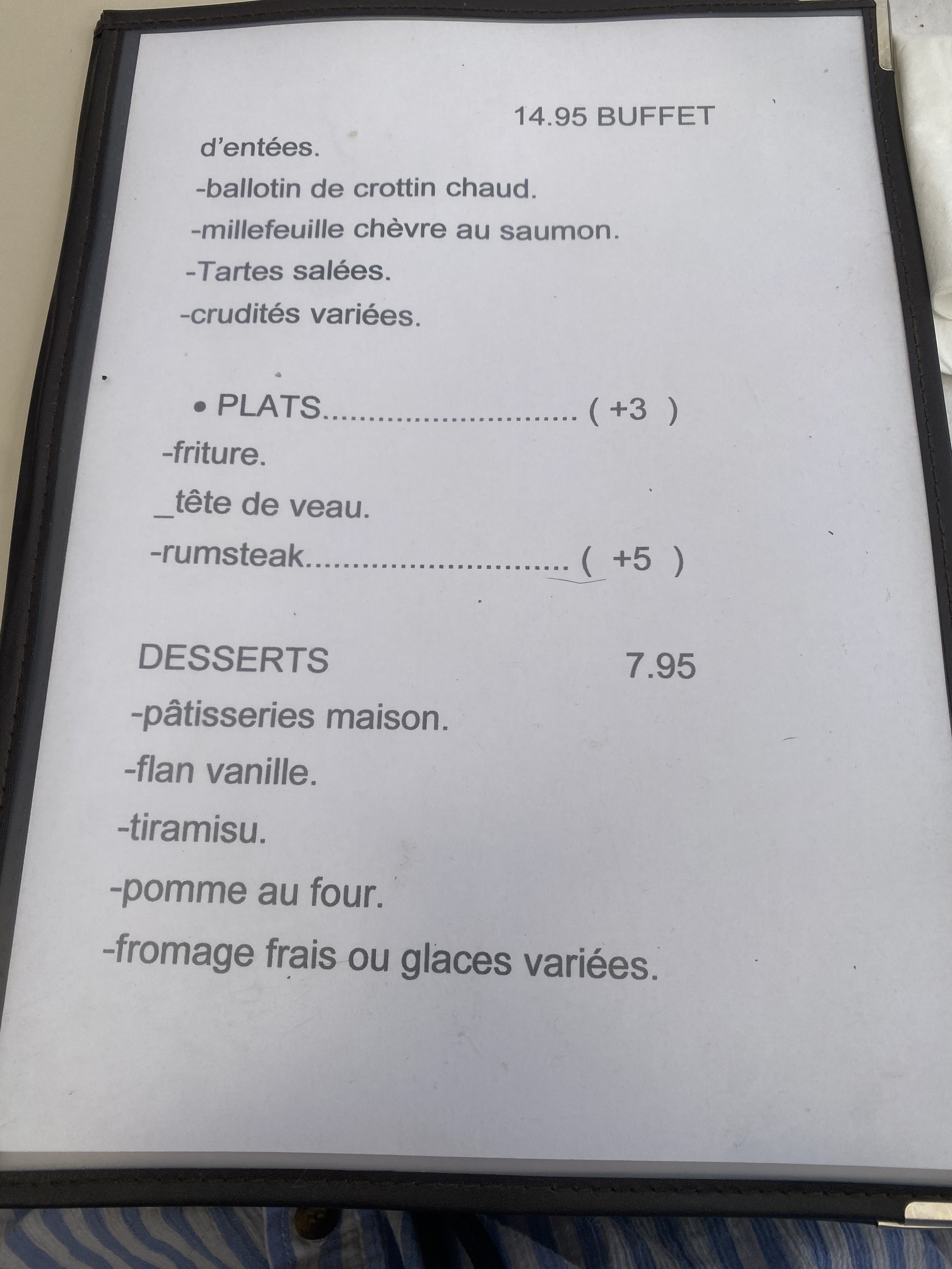 ATTENTION Ne vous faites pas avoir Une carte non conforme à un menu. Vous indique buffet 14,95 avec un dessert Ensuite indique : Plat principal + 3 euros Ou Viande rouge + 5 euros Et SURPRISE facture(manuelle!) Buffet 14,95 (carottes,œufs dur, tomates, bout de quiche) Plat 18,90 ? Mediocre Arnaque à 2 on s en ai sorti pour 70 euros, c est une honte J aurai dû prendre photos De plus manque de propreté