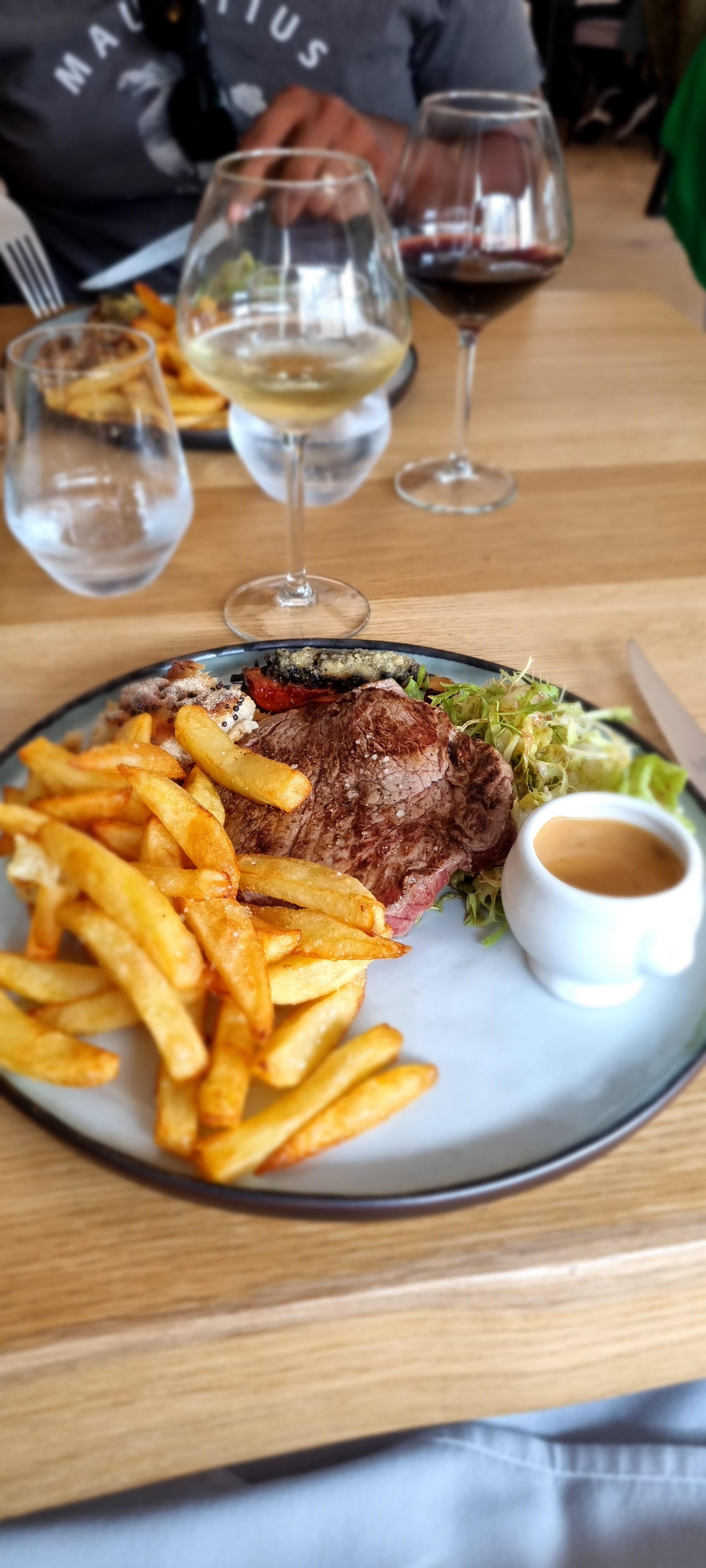 Repas très savoureux. Service sympathique et portions généreuses. Nous avons pris 4x le menu du jour pour 24€ et une bouteille de chardonnay, excellent vin. Commencez par une grande salade ou un pâté (terrine), puis un bon steak avec légumes et pommes de terre ou une daurade. Glace ou gâteau en dessert. Hautement recommandé.