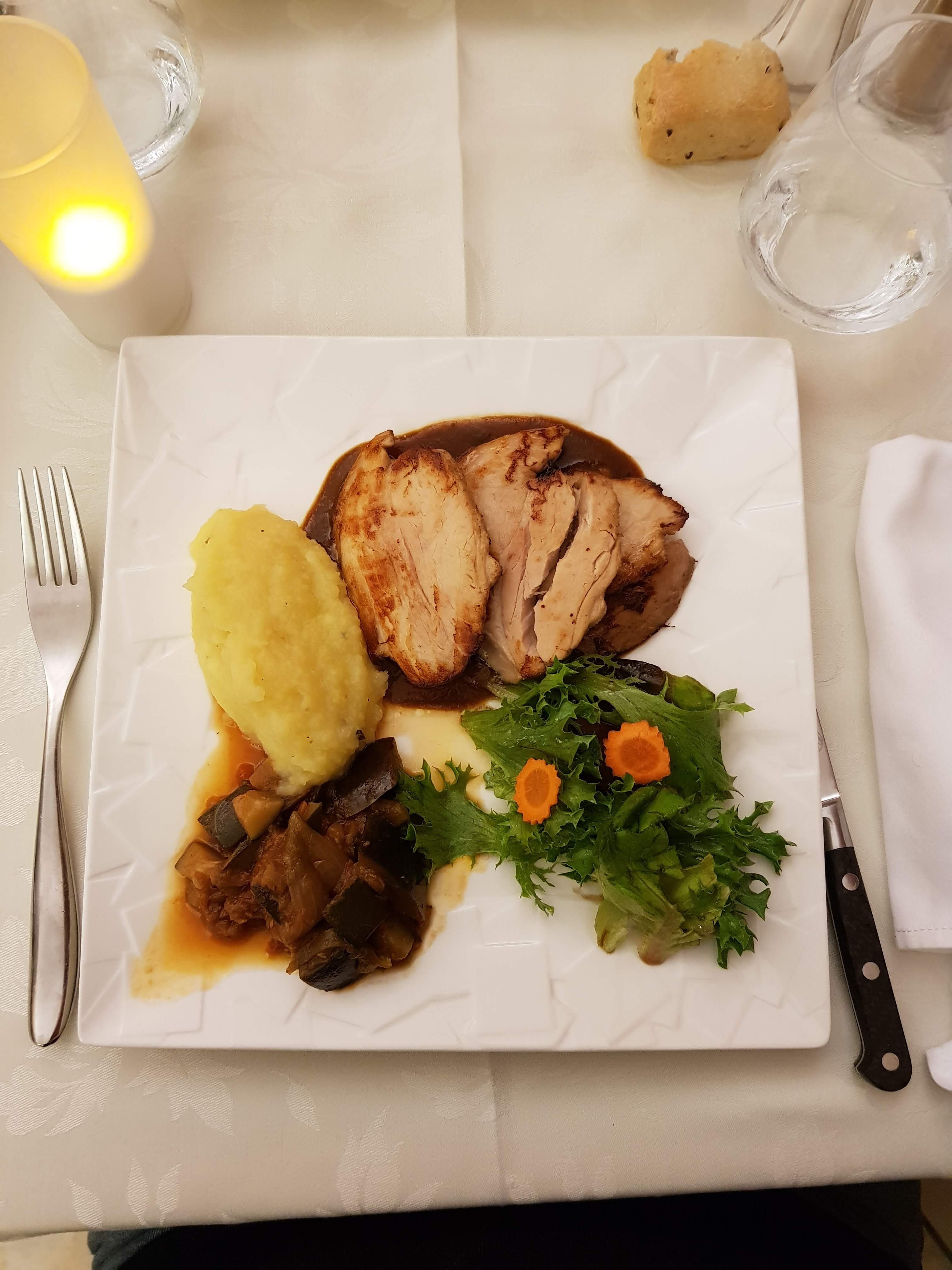 Petite déception par rapport au tarif. Du fait maison, mais manque d'originalité...une salade verte en accompagnement de la terrine en entrée et de nouveau une salade verte pour le plat chaud. Cuisson viande Top, légumes : frites😞 même maison pas le must... Dessert maison : entremet au fruits rouges alléchant et au final à la pêche ou à la poire au sirop😏je ne me souviens plus. Verre au vin et là la quantité était limite... Et le dessert n'a pas été facturé sur le menu mais sur mon plat à la carte car nous l'avons mangé à deux...5 € de plus.
