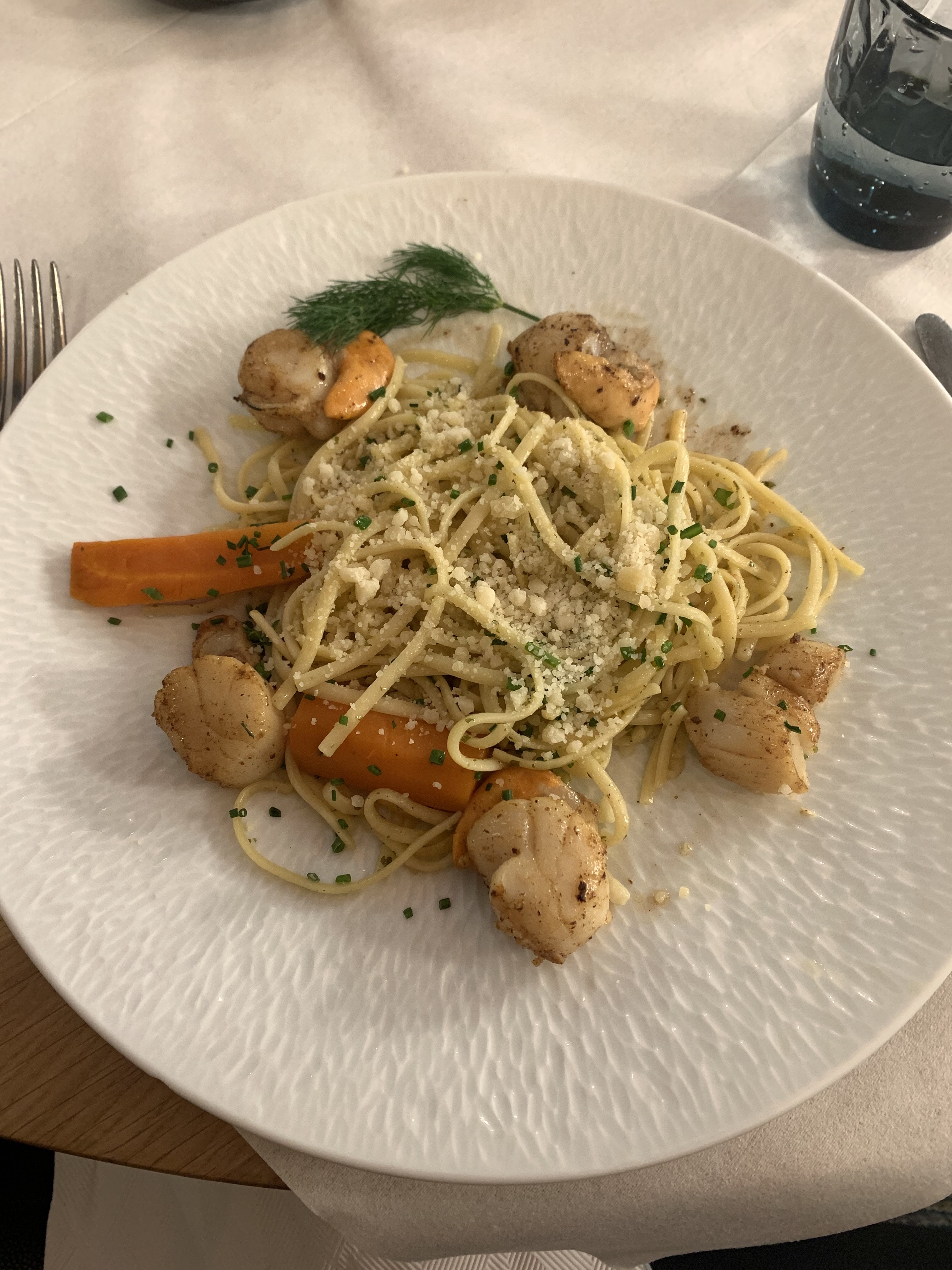 Ambiance brasserie parisienne avec copie des bouillons et qui laisse un charme Personnel discret et accueillant Belle carte, idem pour celle des vins avec les accords selon les plats 2nd restaurant sur le Tréport où le pain a du goût 🤗 Plateau de fruits de mer, linguine aux st jacques Rully pour accompagner les plats : alles es gut Terrine de pommes et plateau de dégustation de calvados : 12, 15 et 20 ans 😇😇😇
