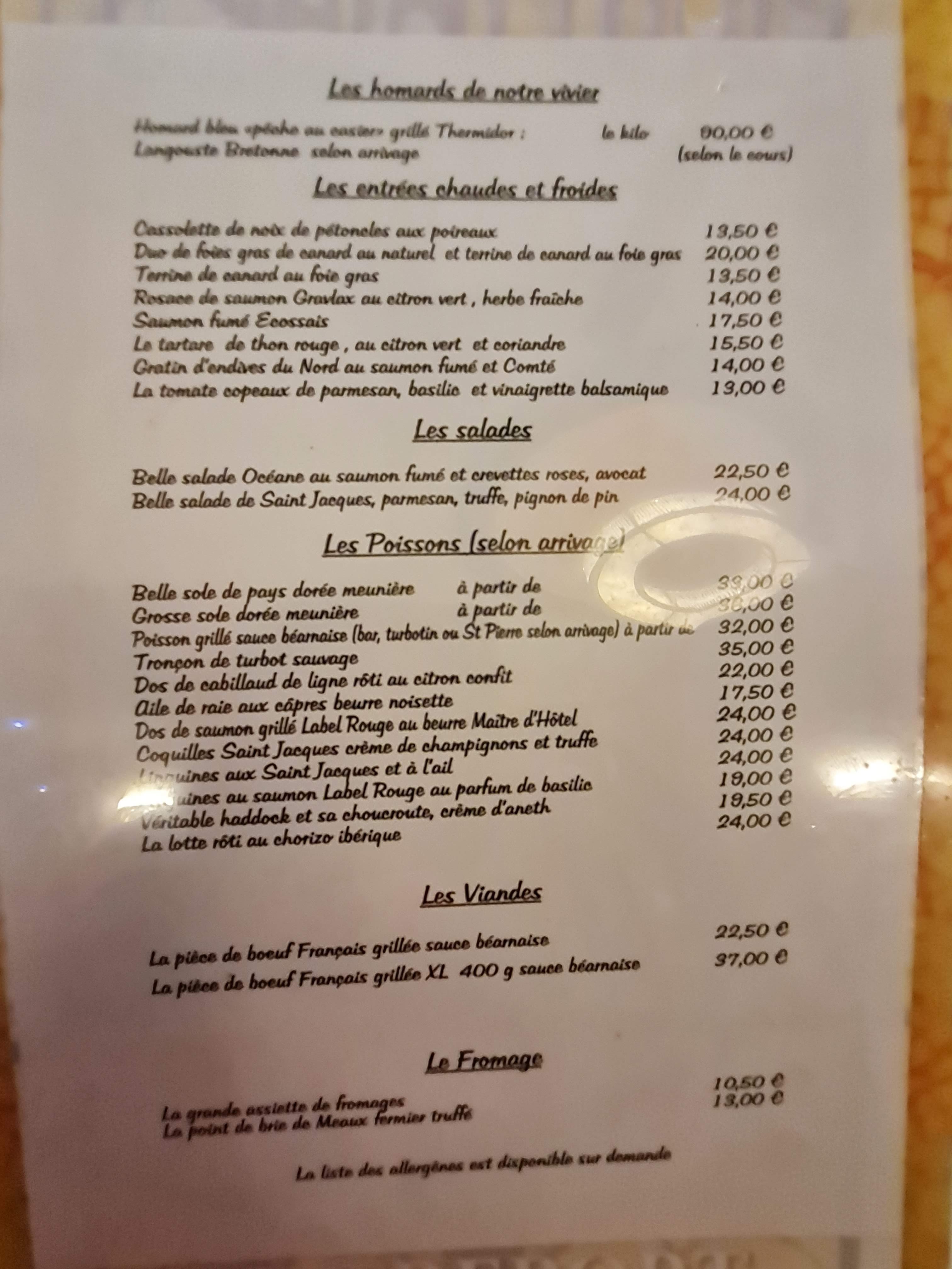 Si vous souhaitez un repas gastronomique FUIEZ!! menu 49,€ affichage demi homard bleu= langouste ( serveuse interrogée= pas de homard depuis 1mois! Directeur= problème d approvisionnement cette semaine! Mais toujours affiché au menu extérieur et distribué sur table!!) Demi langouste servie sur glace! Gigot d agneau de prés salé (demandé rosé= servi cuit) servi avec carottes et courgettes cuites à l eau sans saveurs! Restons positif! Bon champagne en aperitif et sancerre rouge en vin Service sympathique cadre confortable certainement bien pour manger un plateau de fruits de mer car pas de cuisine! (reserve= nous n avons pas testé) Bref très déçus par rapport aux commentaires exprimés Un petit bistrot au mauvais rapport qualité prix