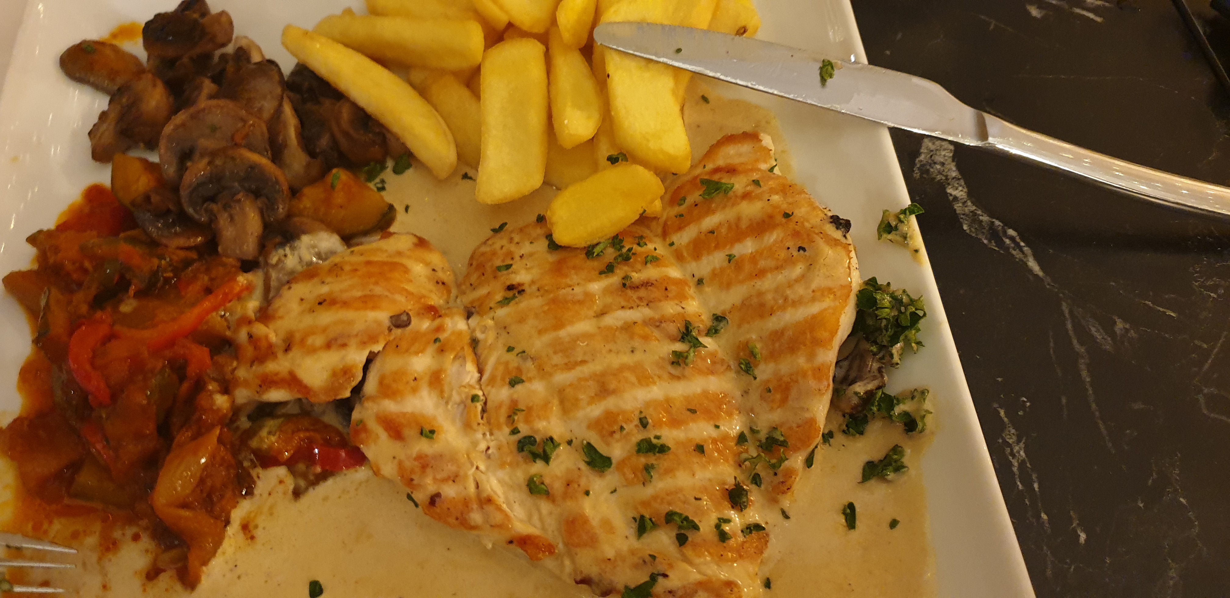 Nous avons etait manger pour une premiere fois un peux deçu des plats de plusieur suggestion salade poulet a la creme avec frite deçu filet de boeuf du chewing gum rien n’etait bon en voulais vraiment manger correctement dire de manger de bon plat mes quelle deception je ne pense plus aller passer un repas midi ou soir car ca ne nous as pas plus en nourriture mes service tres a point et le prix de la note au secour pour avoir pas profiter de manger domage…
