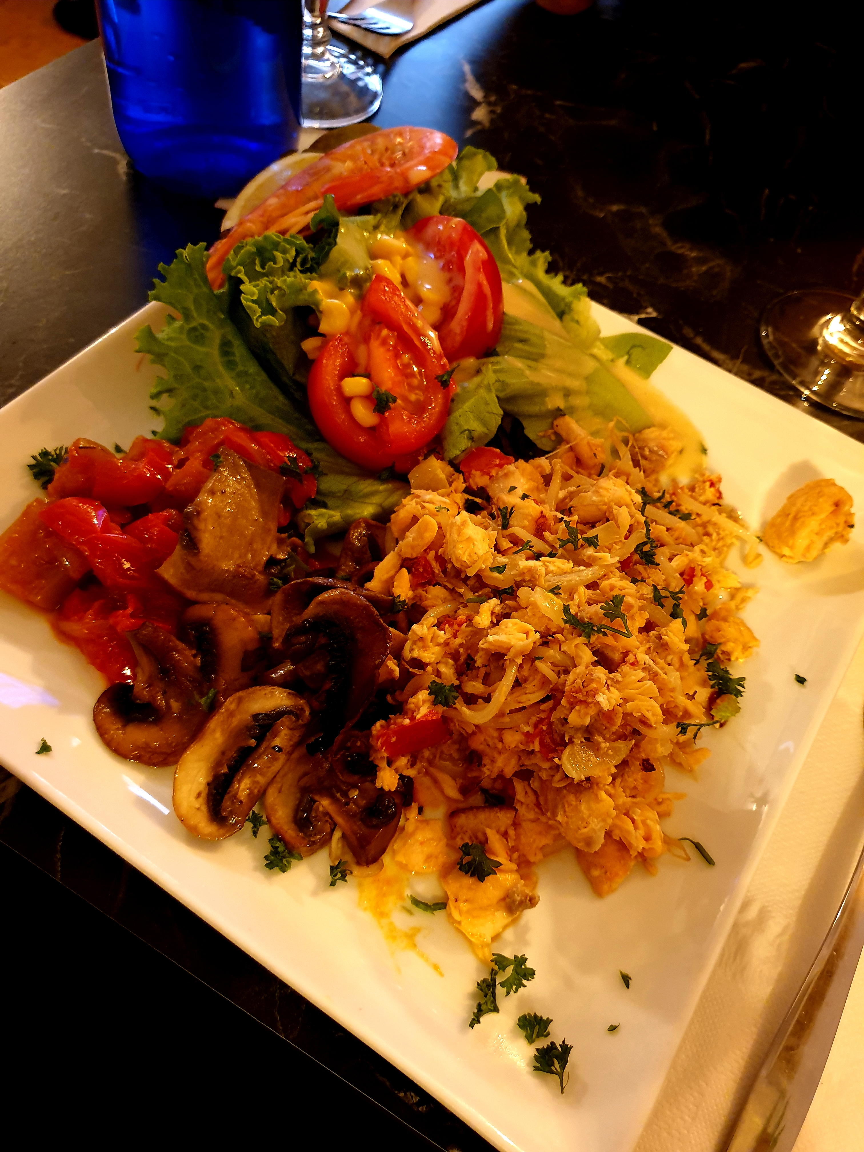 Une table réservée sur le pouce, deux Spritz Limoncello commandés puis deux Pleine forme saumon et volaille.... déçus des plats, saumon pas grillé, soja en boîte pas grillé ... les deux mélangés n'apportent aucun sens au plat si pas revenus ensemble (malgré ce que promet la carte), champignons gorgés d'eau, salade dont le sable encore présent croustillait sous la dent et la gambas cuite mais froide n'apporte aussi aucun goût sauf du rêve. Le décor est sympa et les serveuses de bonne volonté. On a quand même laissé un pourboire pour la petite jeune serveuse.