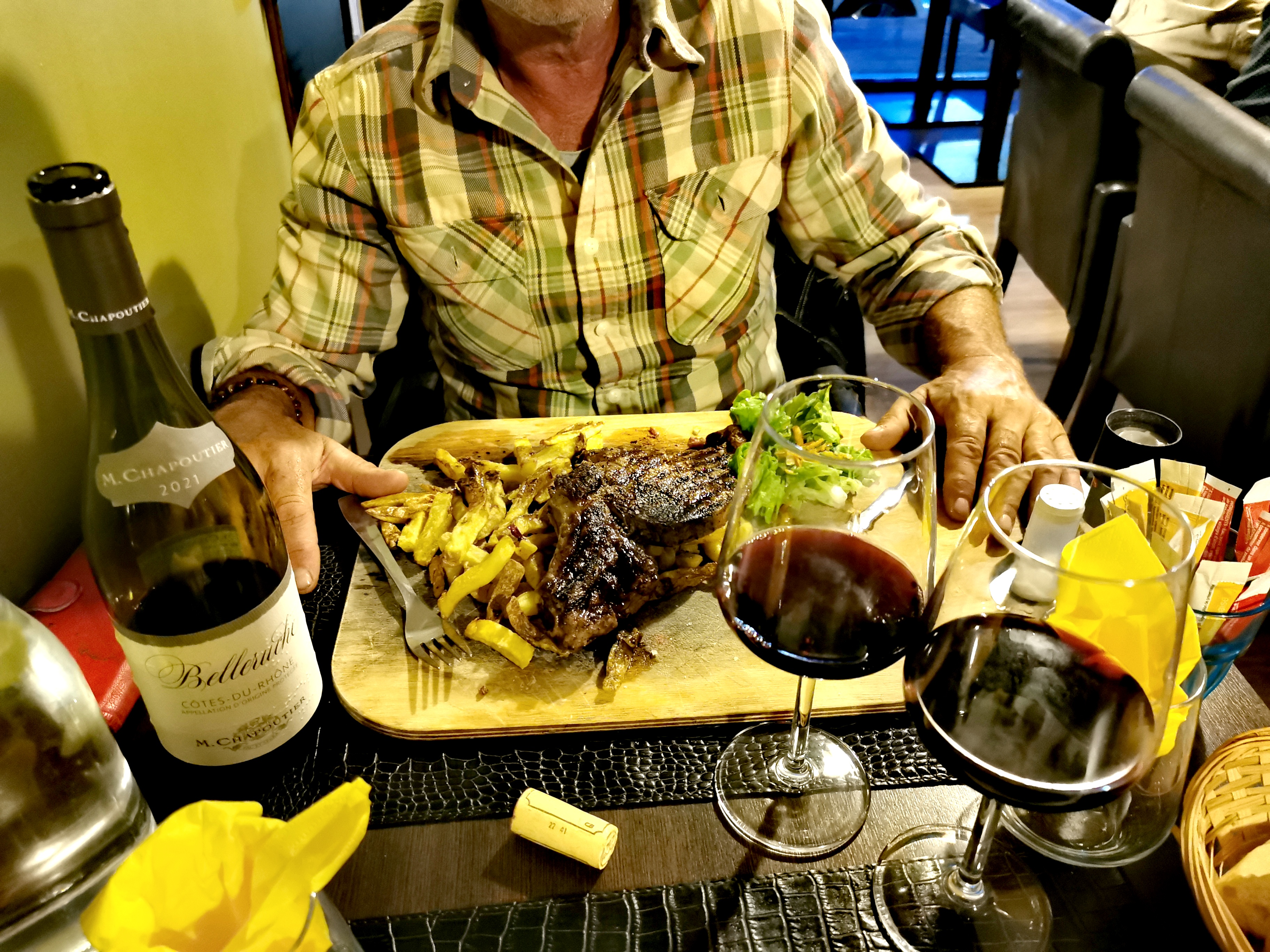 Côte de boeuf maturée topissime 😋 Frites maison 👍 Kfé gourmand extra, rosé local bien sélectionné, terrasse et services agréable... Bref, nous y reviendrons avec grand plaisir !