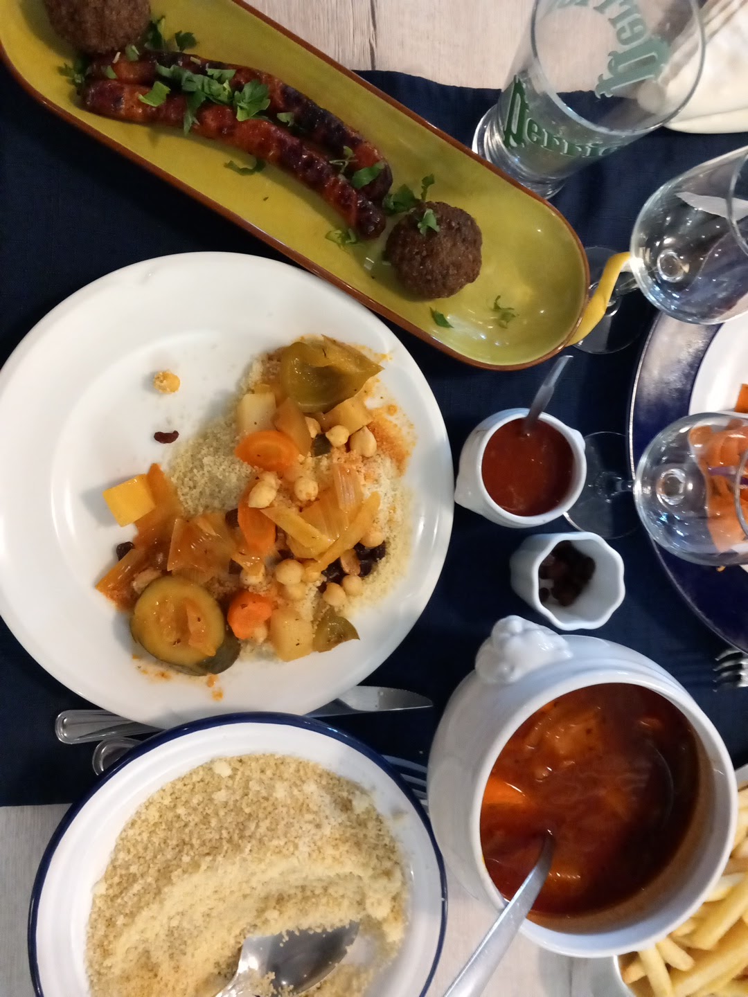 Bon accueil du groupe. Bon couscous avec choix entre poulet et agneau en plus des merguez et des boulettes. Copieux et bon.