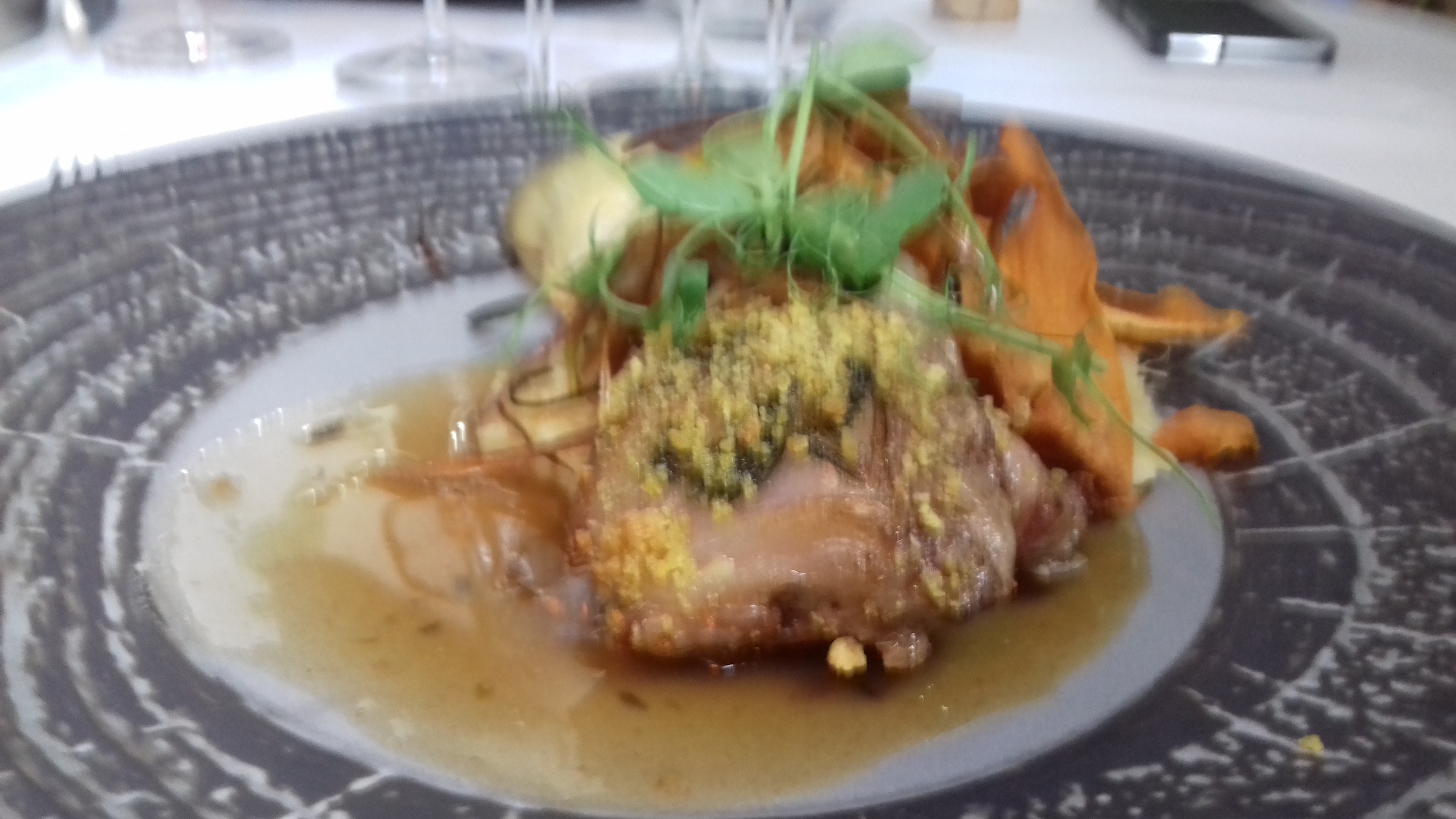 Un délice des papilles.. Beaucoup de parfums et de finesse dans l'assiette.. Un excellent repas dans un cadre trés agréable. Dommage toutefois que le service soit aussi impersonnel et peu chaleureux. Professionnel certes, et courtois.. Mais manque de convivialité. Pour fréquenter d'autres tables gastro, l'accueil ici n'est pas à la hauteur.. Il manque aussi la présentation orale du plat, et les explications qui vont avec... Quelques amuses-bouche seraient aussi bienvenus lors de l'apéritif, au vu du tarif des vins.. Mais je me suis concentrée sur le plaisir de la dégustation, qui lui, était au rendez-vous..