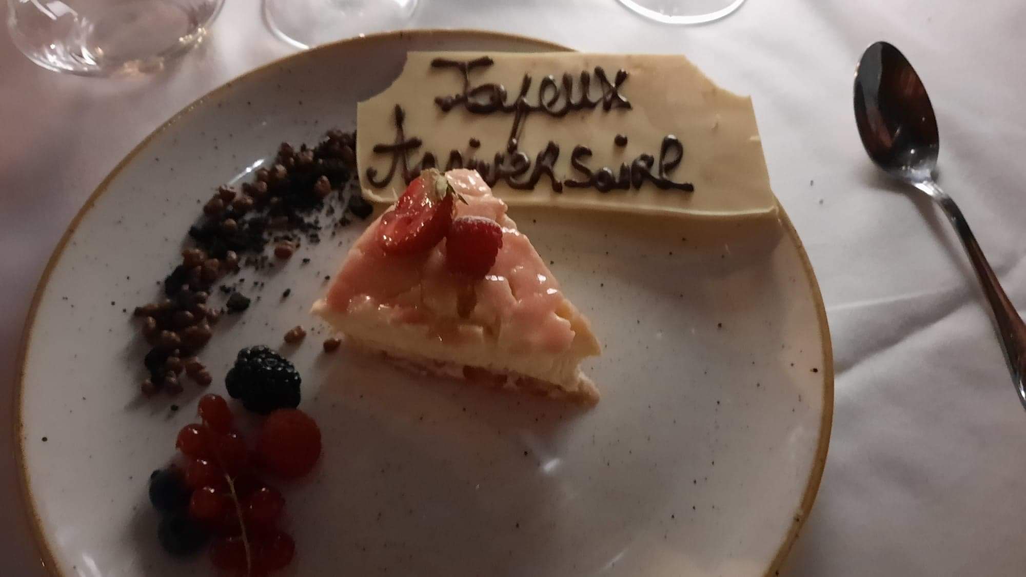 Un super moment pour nos 16 ans de vie commune une cuisine raffinée aux saveurs de saison de l'amuse bouche au dessert Un service irréprochable agréable discret et très professionnel Un cadre reposant et très agréable la terrasse ferme à l'arrière un vrai moment de pur bonheur . Nous reviendrons c'est sur Bonne continuation à toute l'équipe et encore merci pour la petite attention avec notre superbe dessert