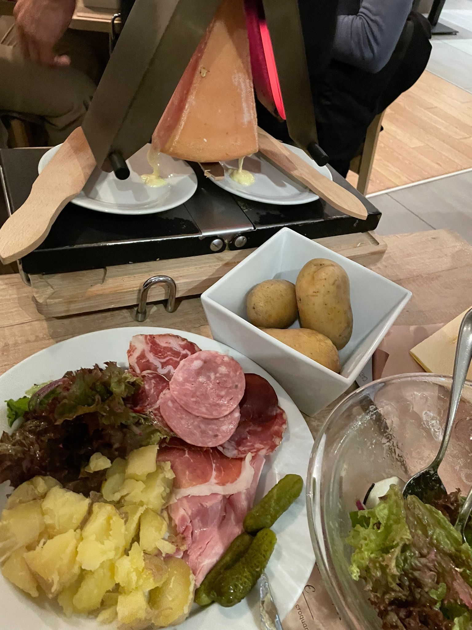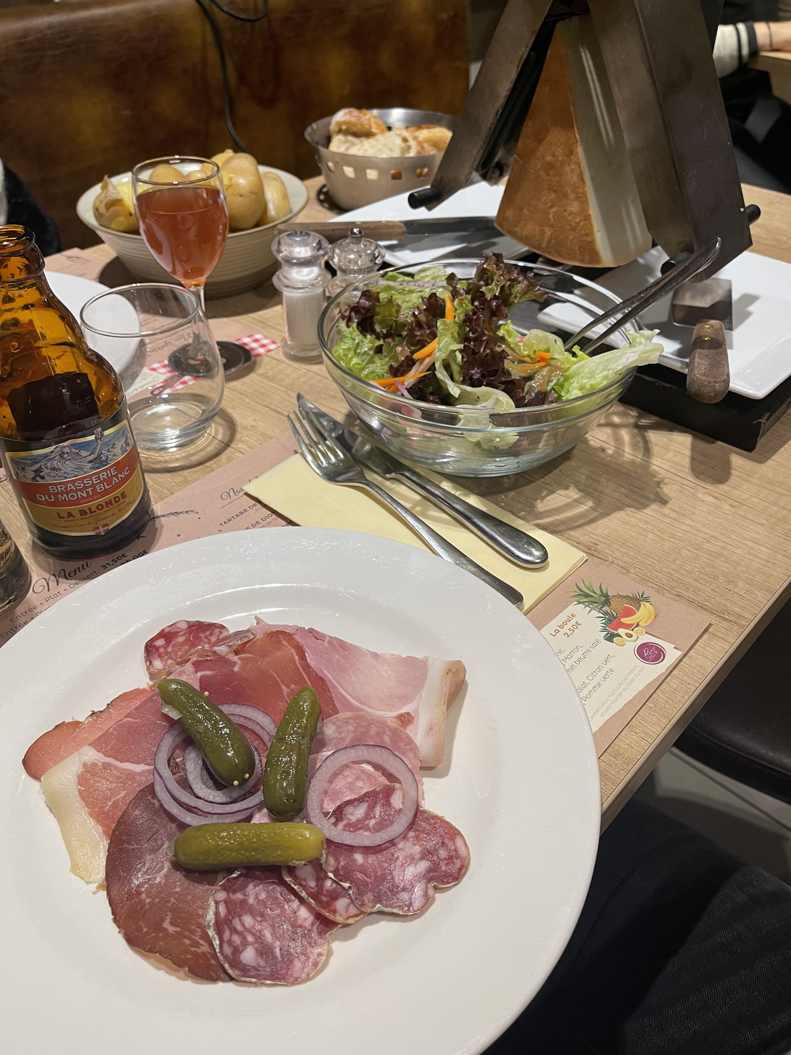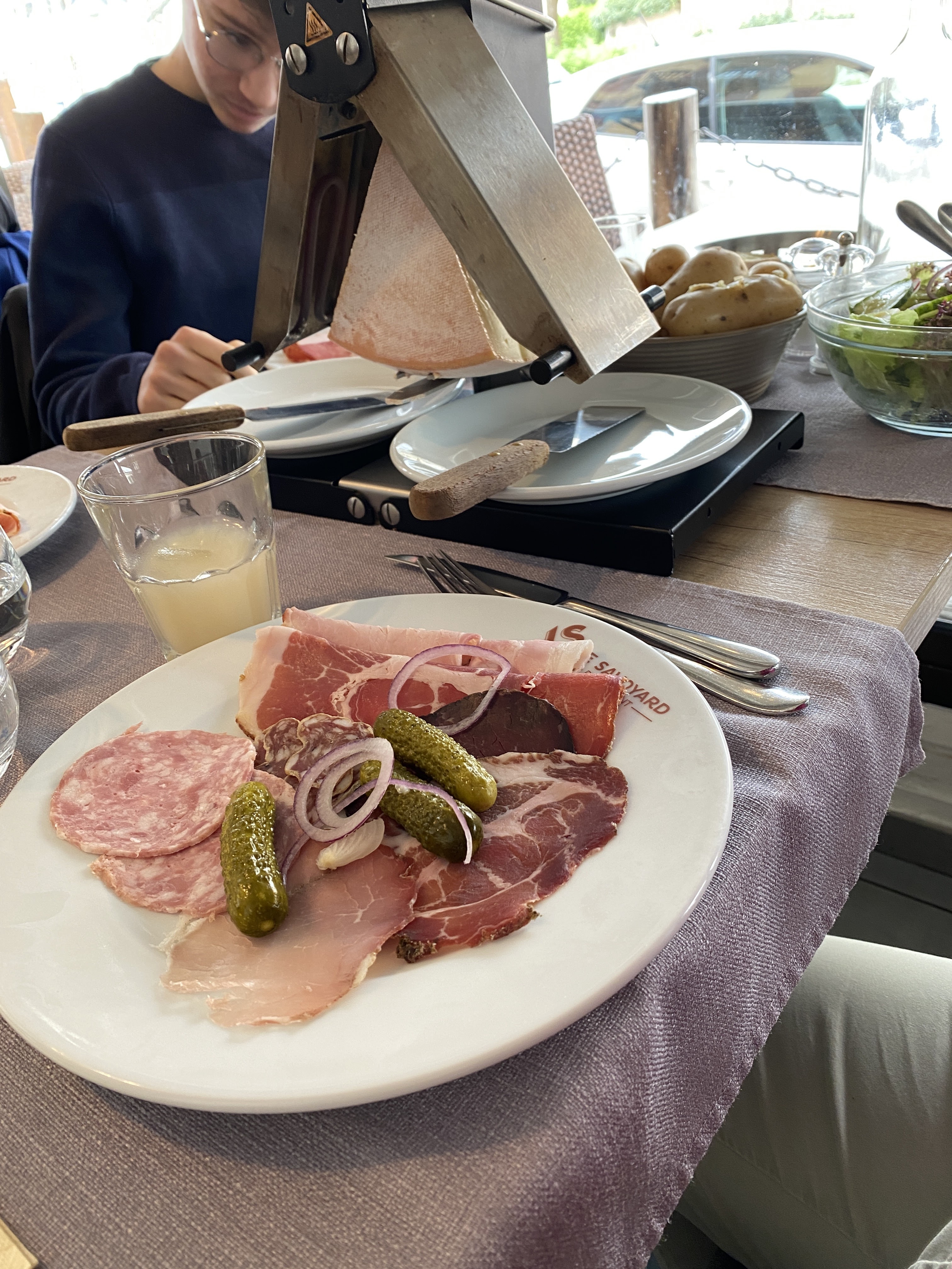 Raclette excellent en bonne quantité qu'avec de la charcuterie et des pommes de terre. Parfait Les desserts sont énormes et très bon.