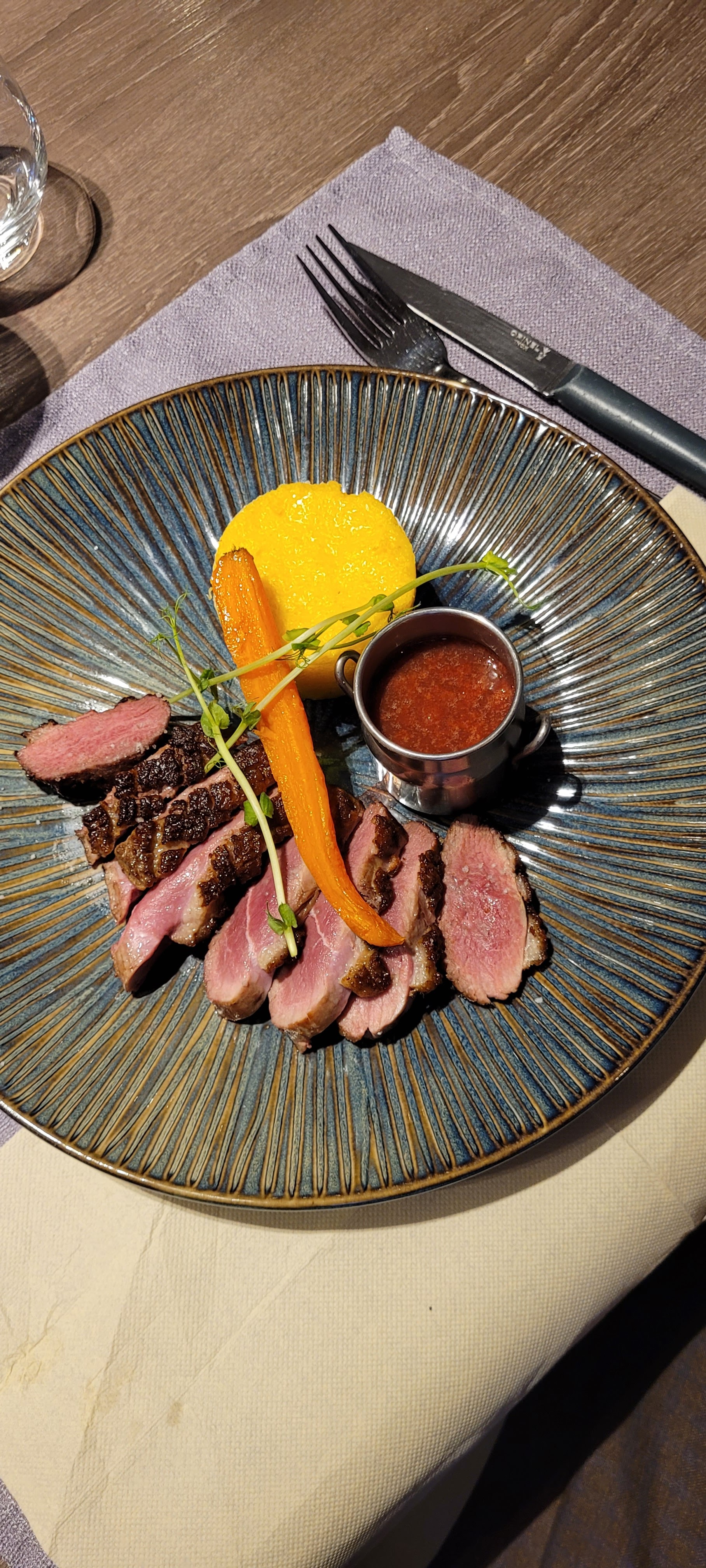 Très bonne expérience. Le restaurant est accueillant et le personnel très réactif malgré le nombre de couverts. L'entrée Tataki de canard pour ma part était savoureuse et la fondue avec ma compagne excellente ! Je recommande.