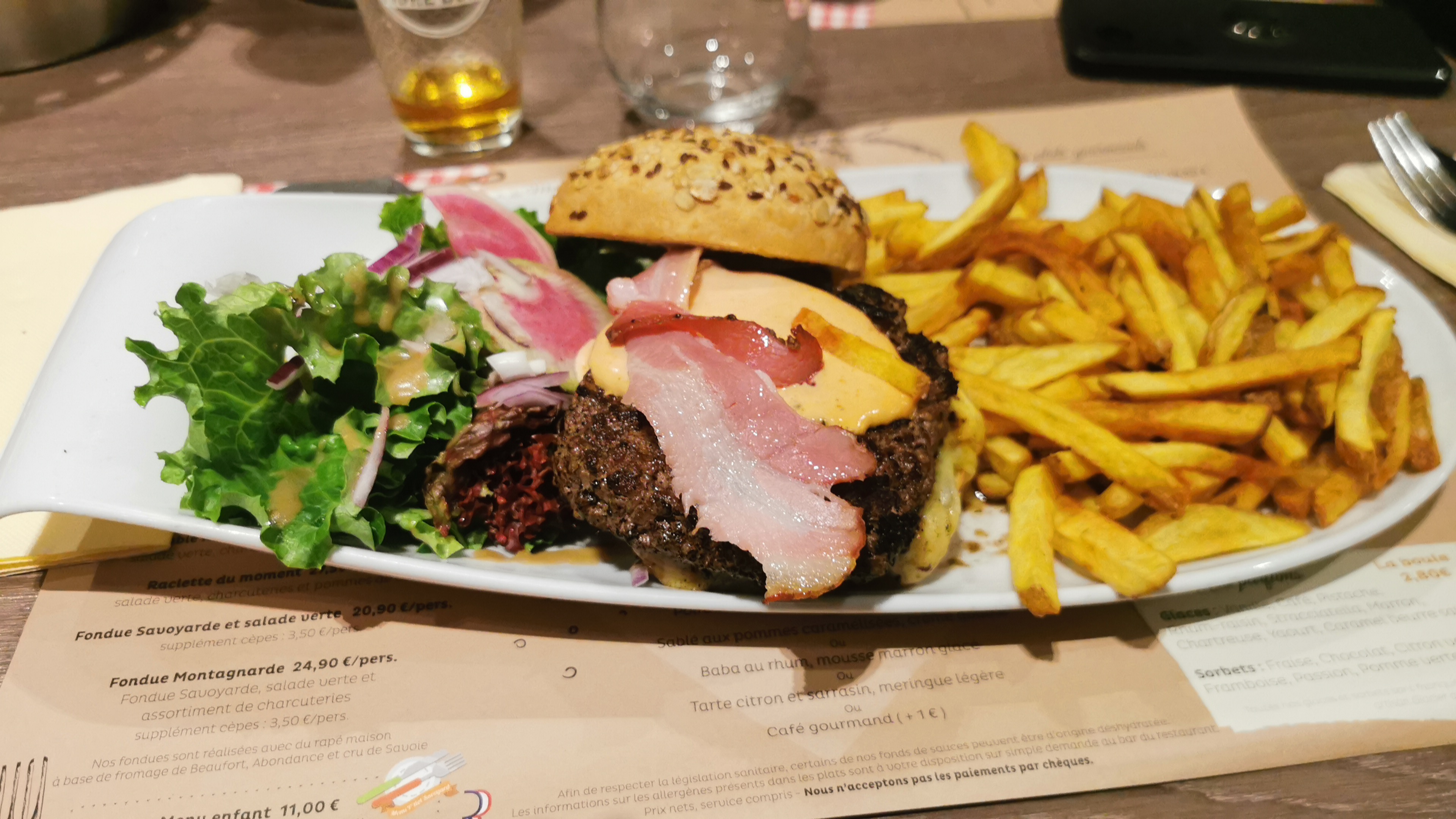 Très bons plats savoyard ainsi que les spécialités apéritives du restaurant. Nous avons pu goûter au Burger Savoyard très consistant et ses frites maison ainsi qu’au Berthoud très bon mais cher pour la quantité. 54€ à deux pour deux apéritifs, deux plats à la carte, et deux café. Restaurant bien entretenu et qui respecte bien les règles liées au COVID-19 (prise de température, distanciation des tables, plexiglas et sanitaire propre). Le service est assez rapide et les serveurs bien formés (propose le menu du jour et s’il manque un plat il le disent aussi) Une belle découverte qui donne envie de tester les autres plats régionaux et non régionaux.