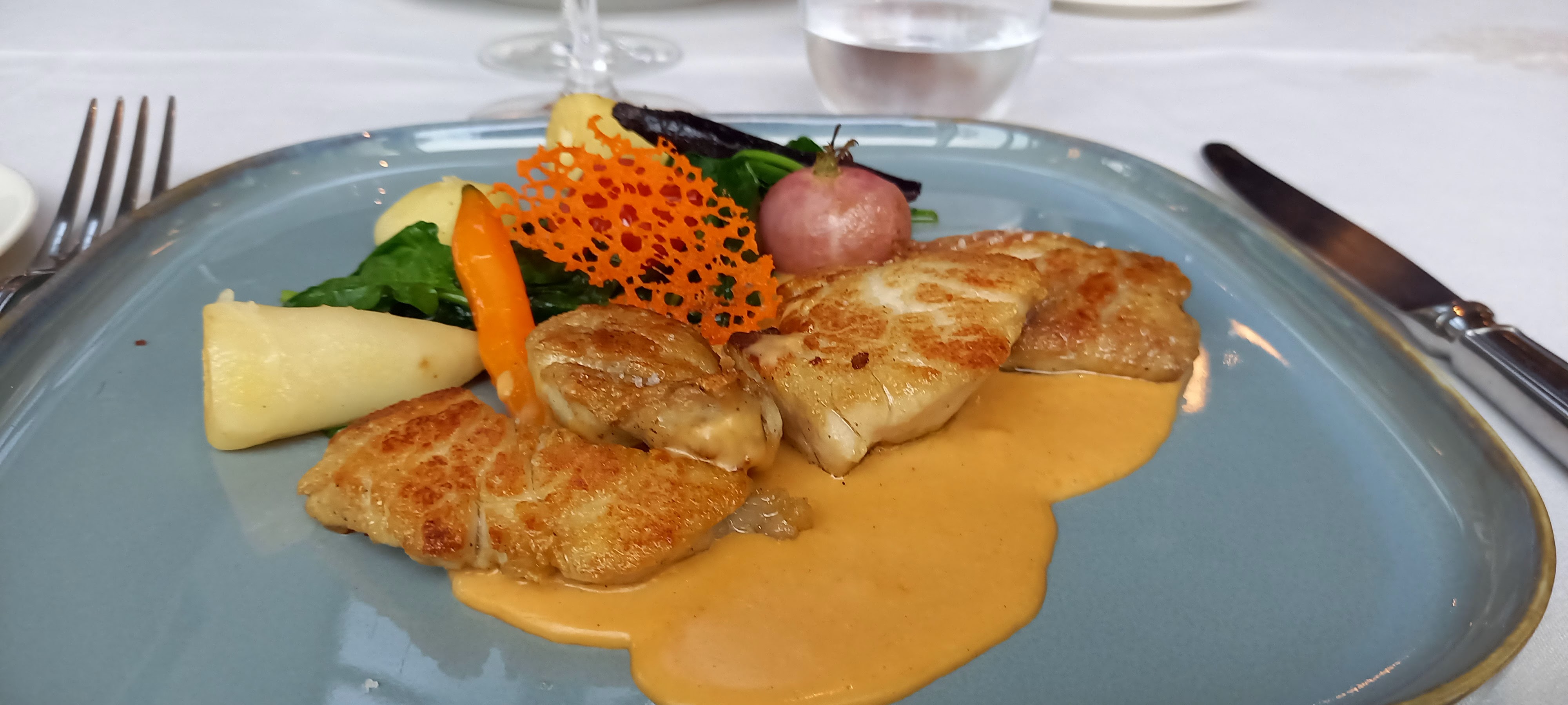 Magnifique cadre, service à l'écoute (dont un sommelier attentif et de bon conseil), cuisine excellente et plats copieux, desserts très beaux et travaillés. Excellente expérience ! Je recommande.