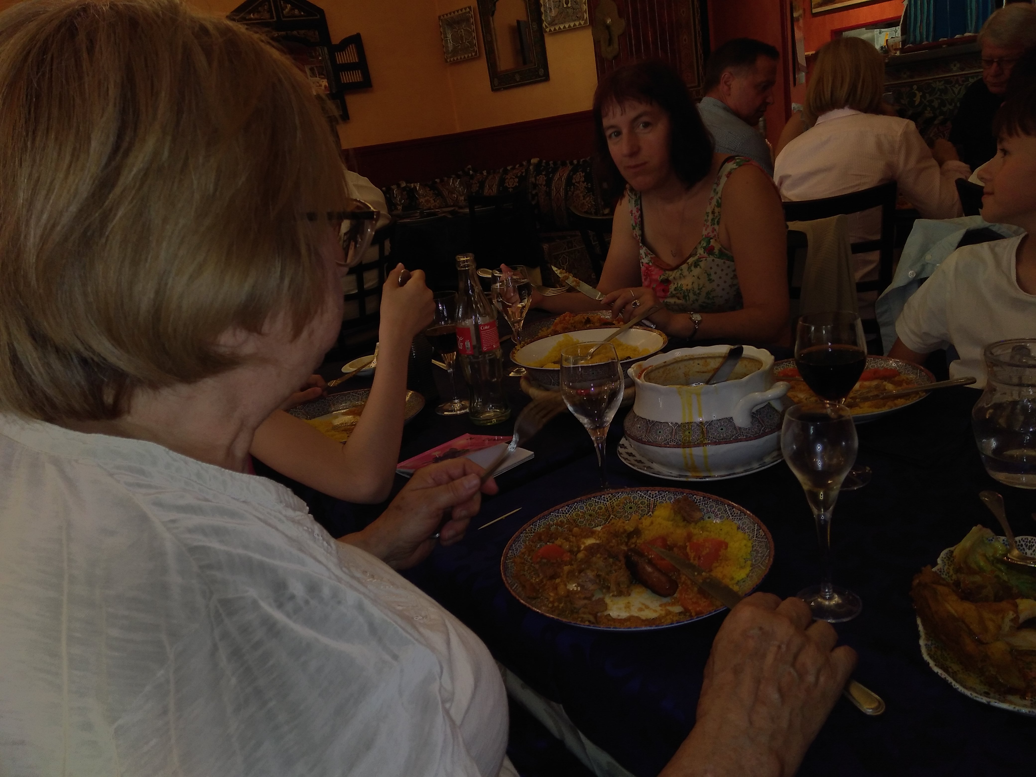 Ce n est pas le meilleur couscous que j ai mangé. C est bon mais sans plus, la semoule n est pas super légère, les boulettes étaient sèches. Je les ai mangé toutes l après midi. Pareil pour le tajine que Madame a pris bien mais sans plus.